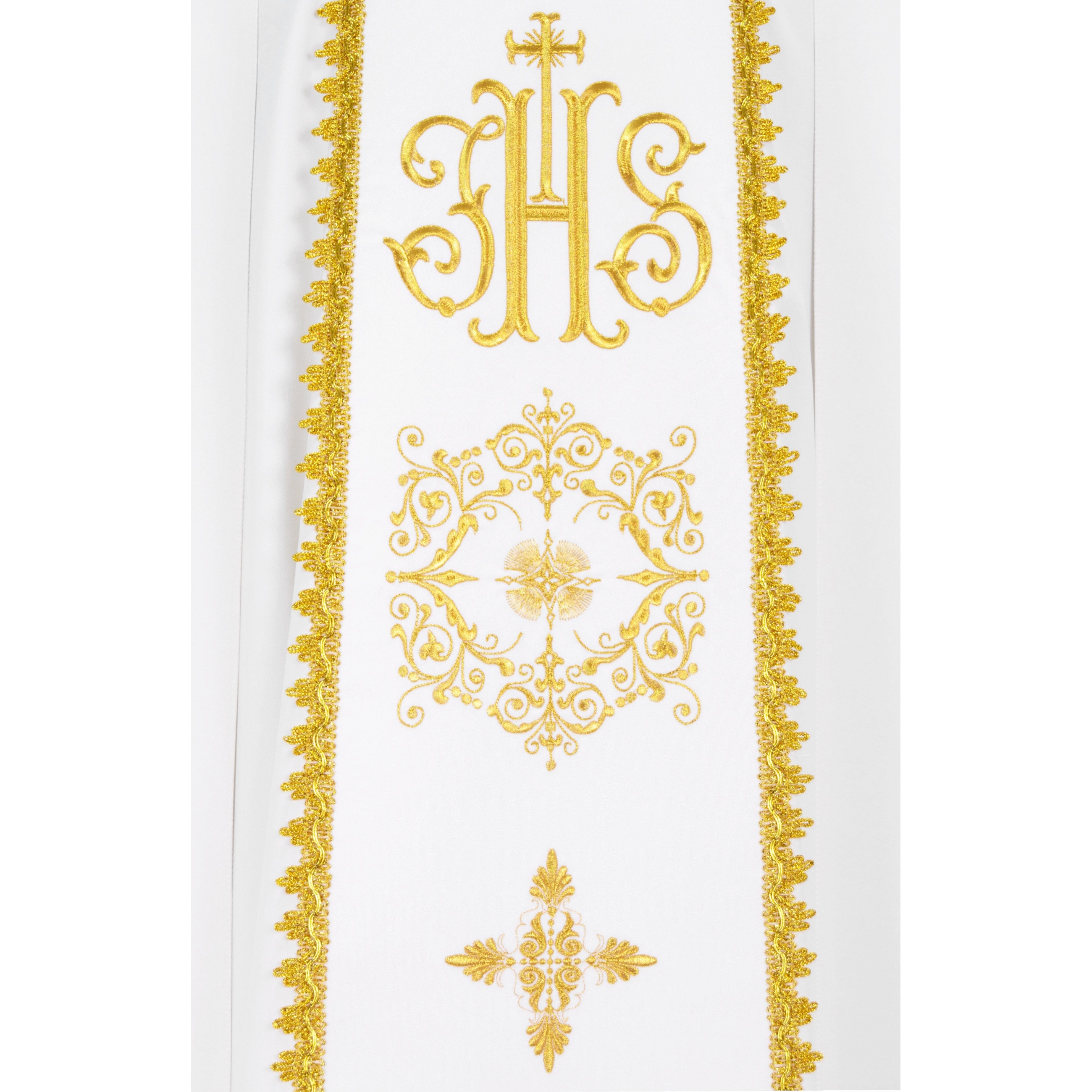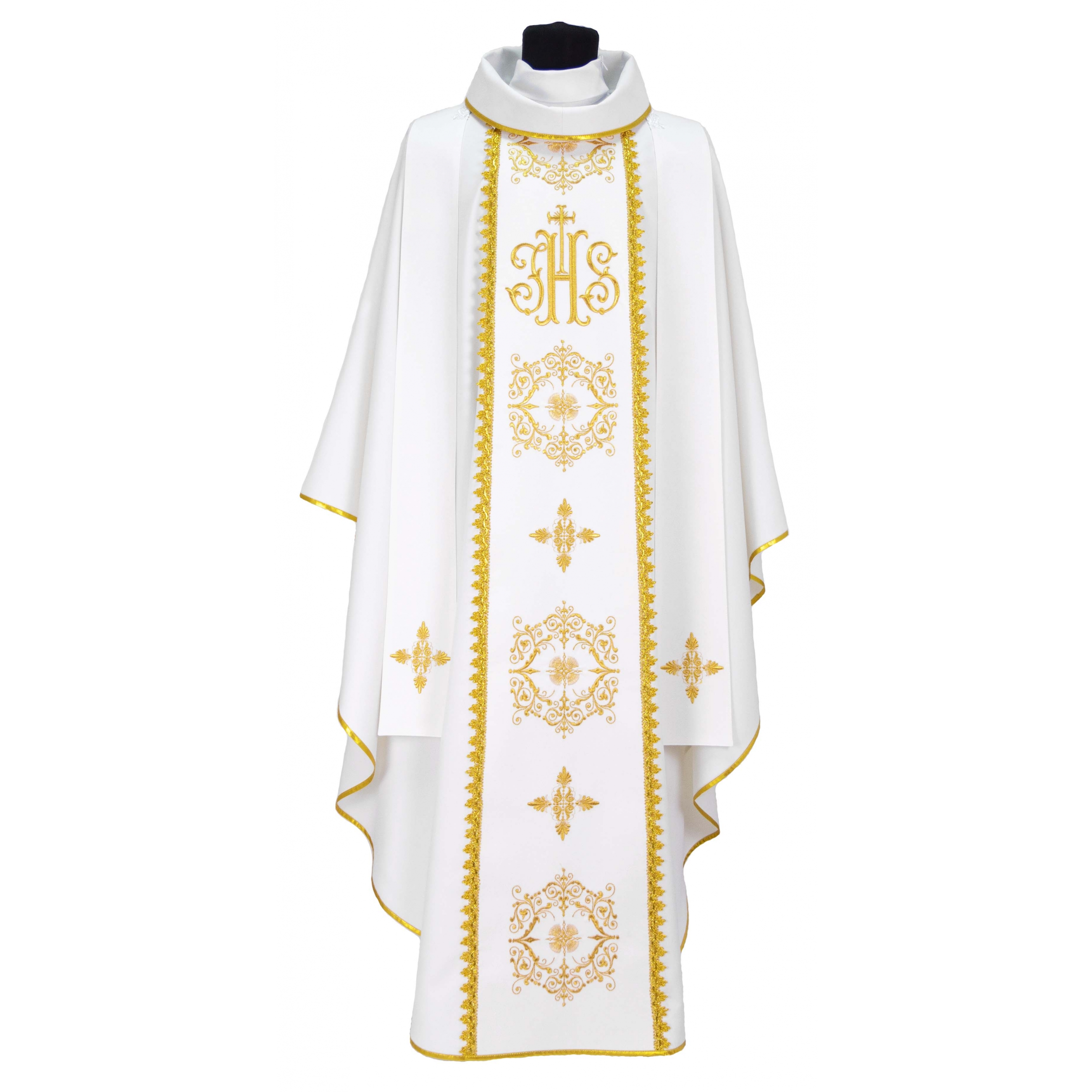 Арнат урачысты, з поясам. Каўнер тыпу "хамут". Адстрочаны залатой тасьмой, аздоблены яркім, прыгожым ўзорам.