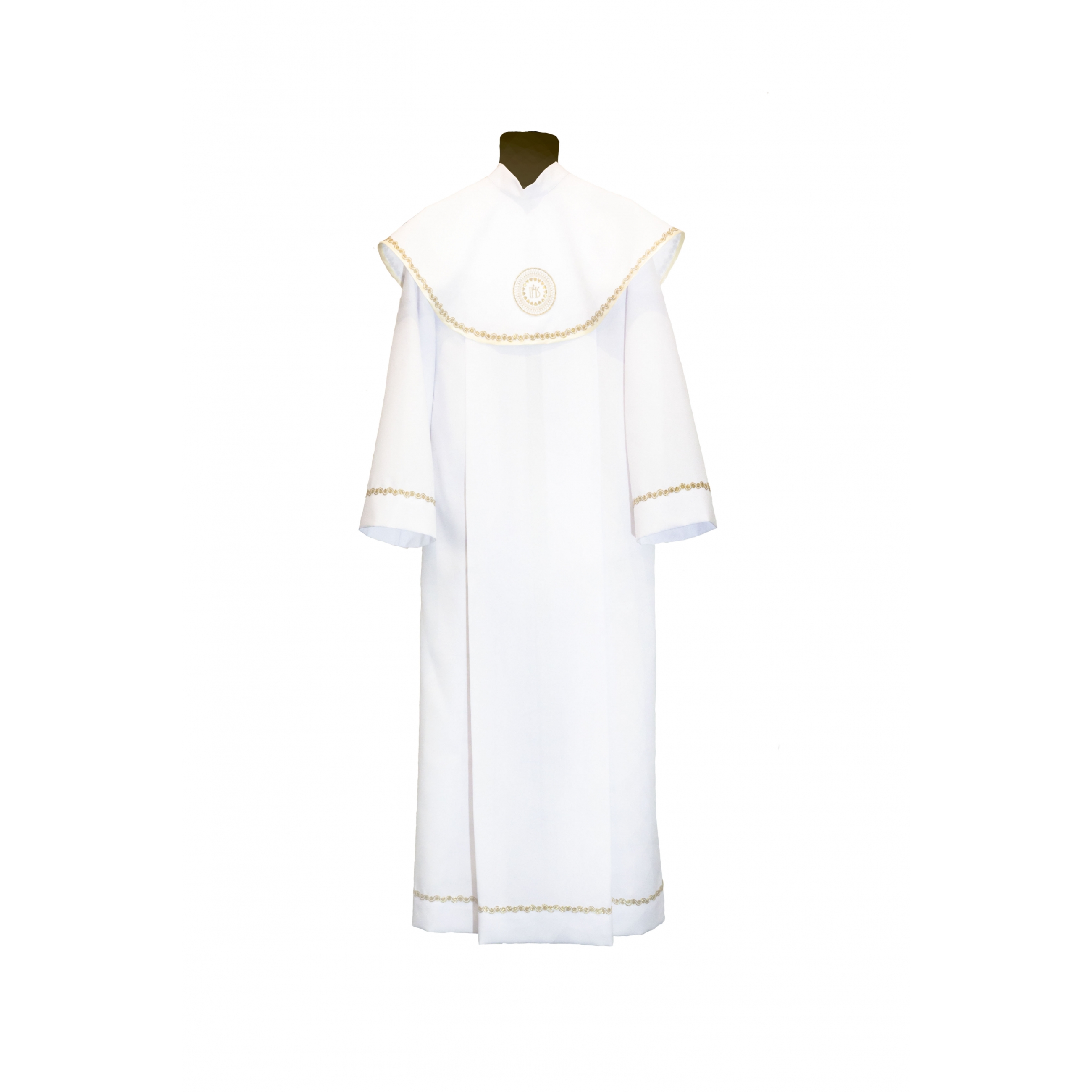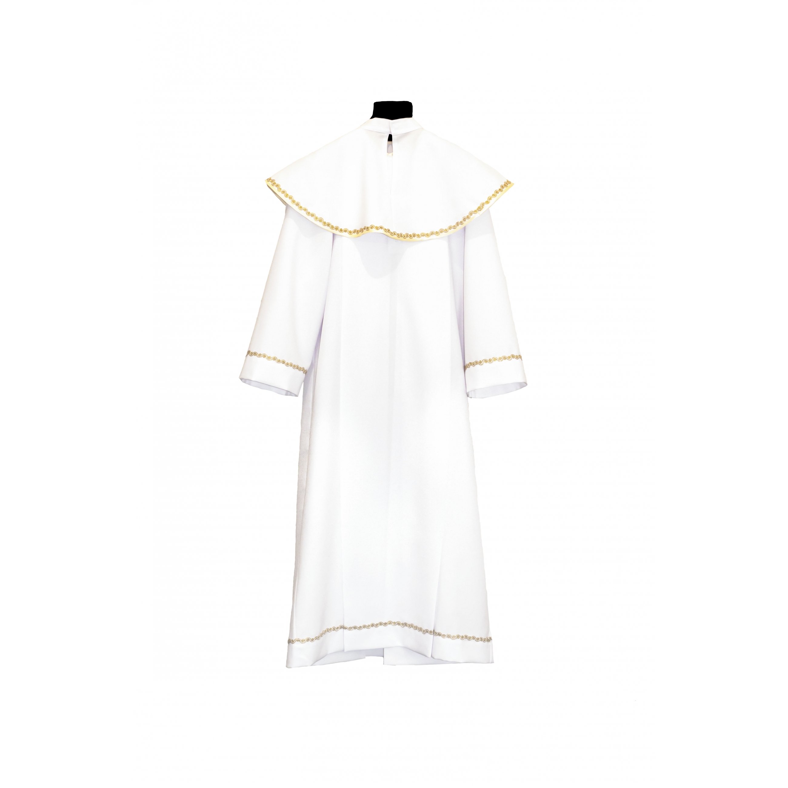 Альба дзіцячая, для першай камуніі. Ніз вырабы, рукавы, пелерына аздобленыя залатой вузкай тасьмой.