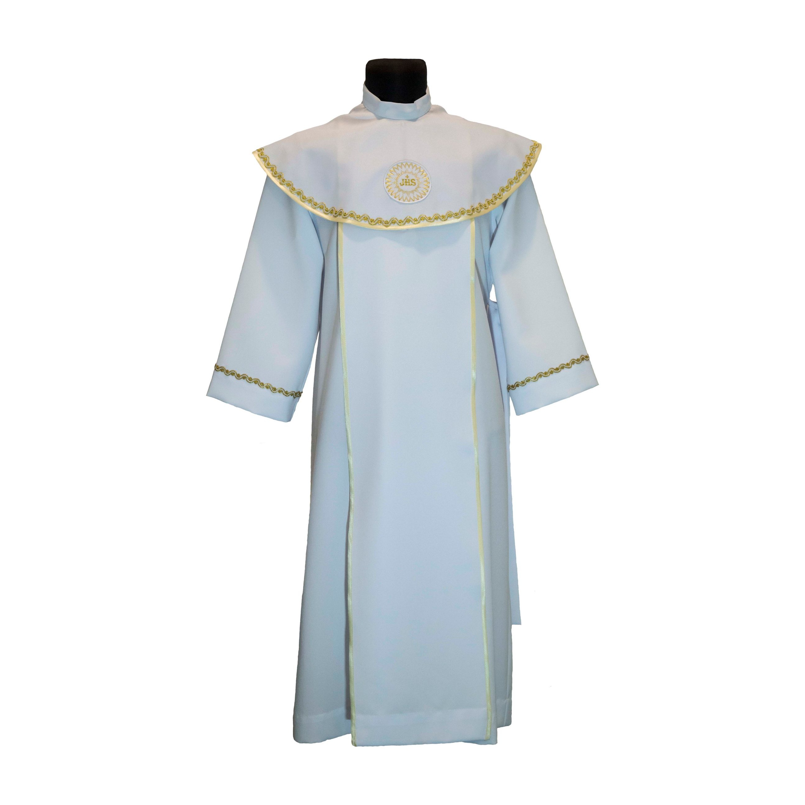 Альба дзіцячая, для першай камуніі. Ніз вырабы, рукавы, пелерына аздобленыя залатой вузкай тасьмой.