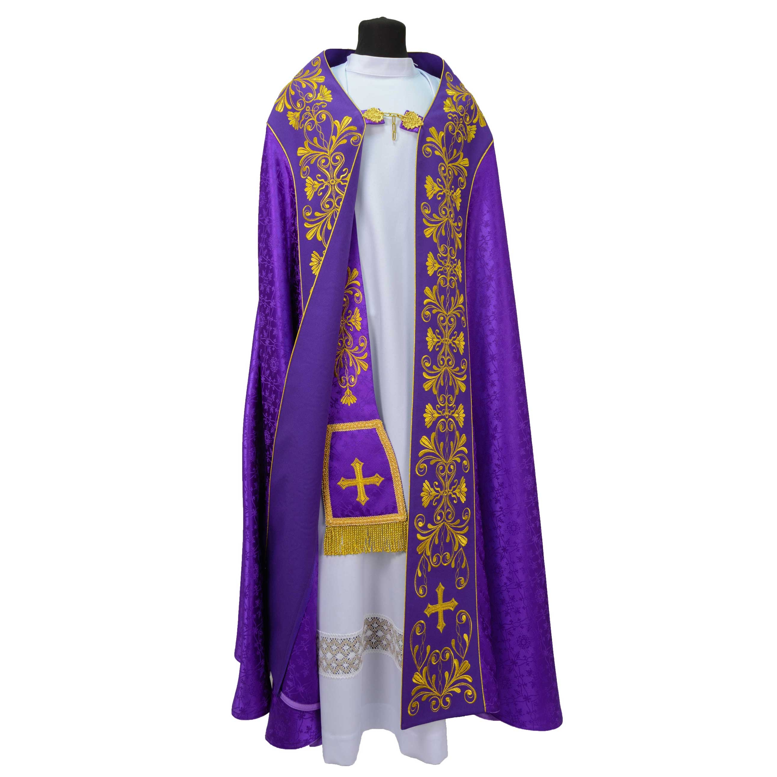 Капа фіялетавая. Аздоблена вышыўкай. Каўнер адстрочаны махрамі колеру золата.