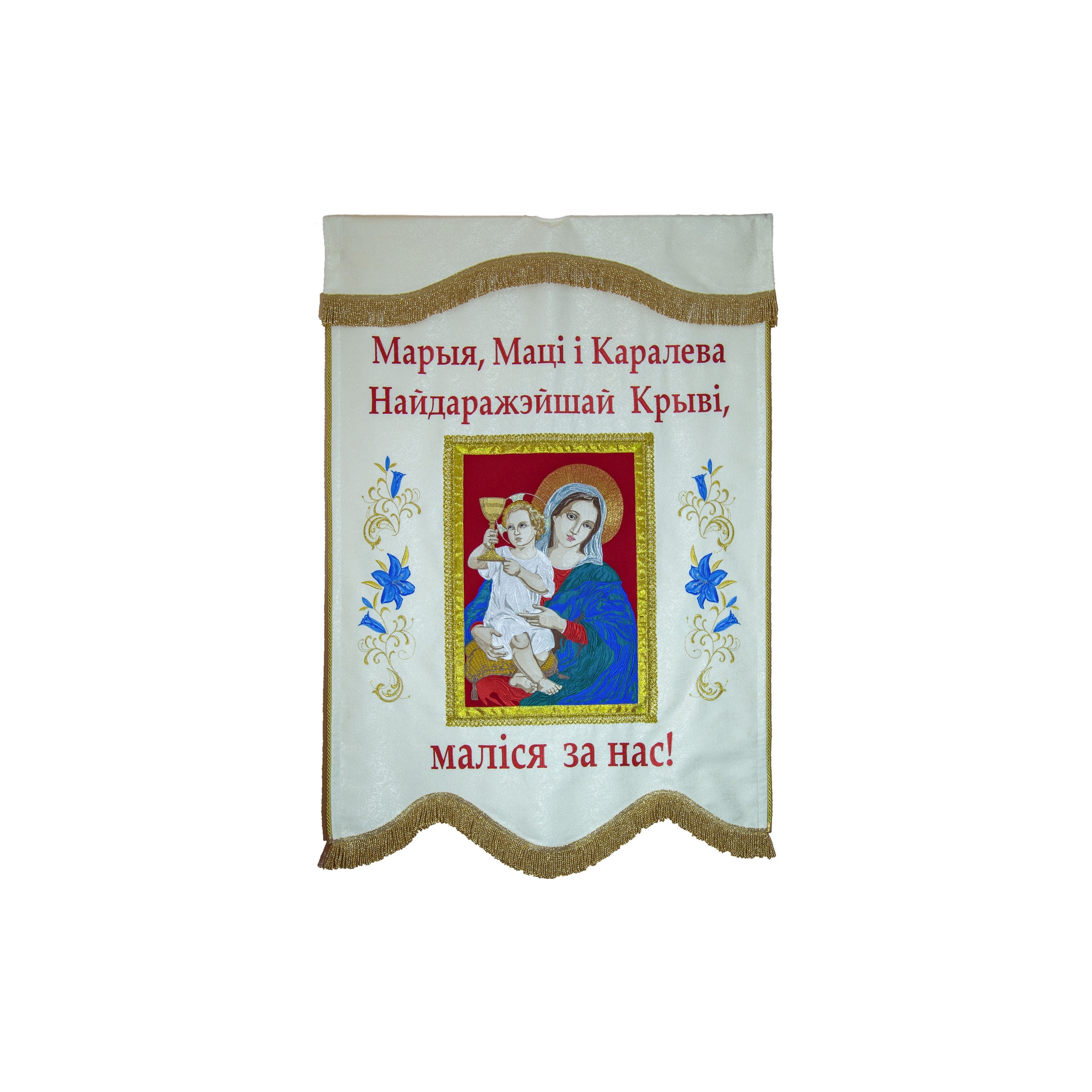 Выраблена з шчыльнай тканіны з прышытай малюнкам. Апрацавала махрамі, залатой тасьмой. Прымаем любыя пажаданні заказчыка.