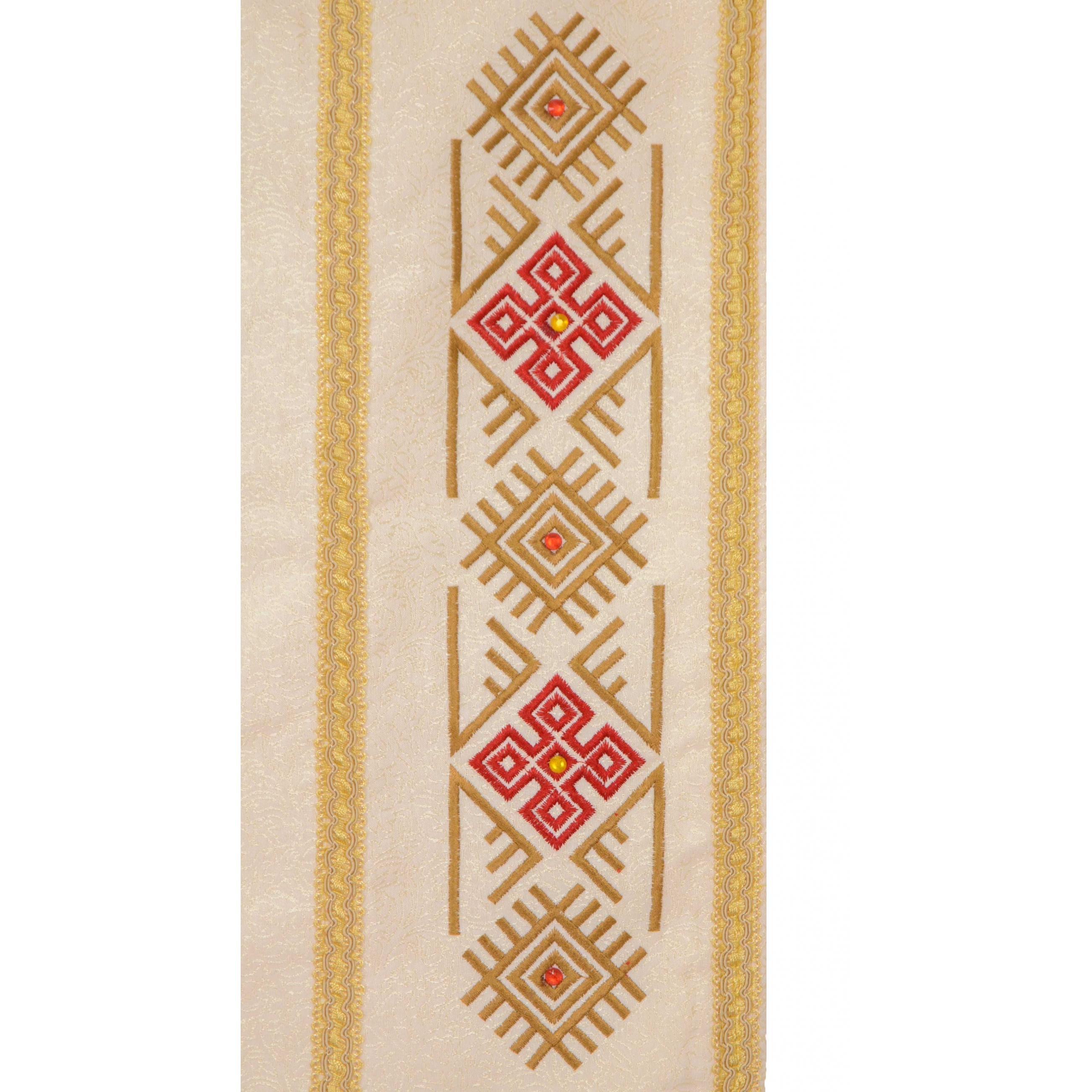 Вышыўка выконваецца шаўковай або металічнай ніткай.Па індывідуальнай замове магчымыя змены аздаблення, ўзору і малюнка.