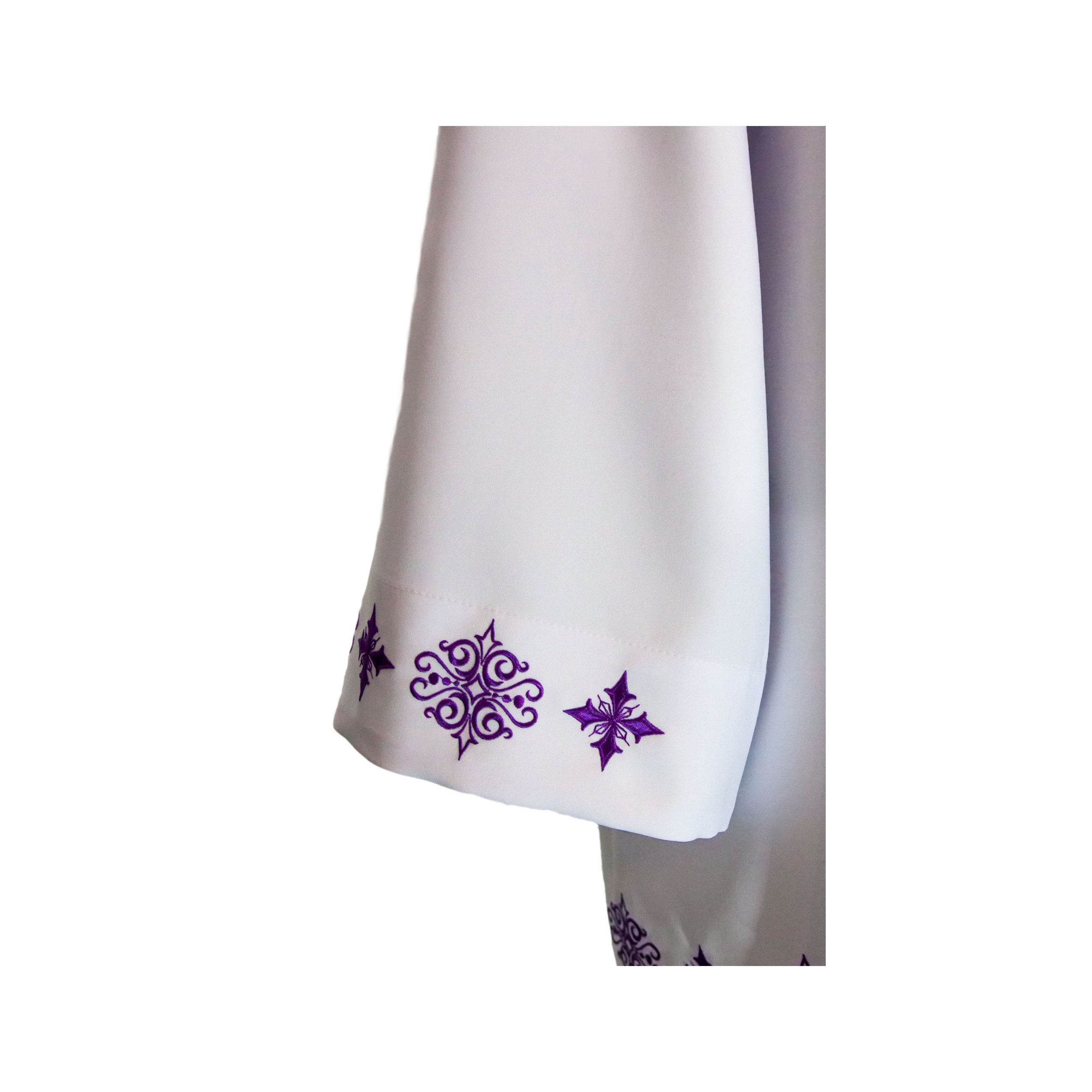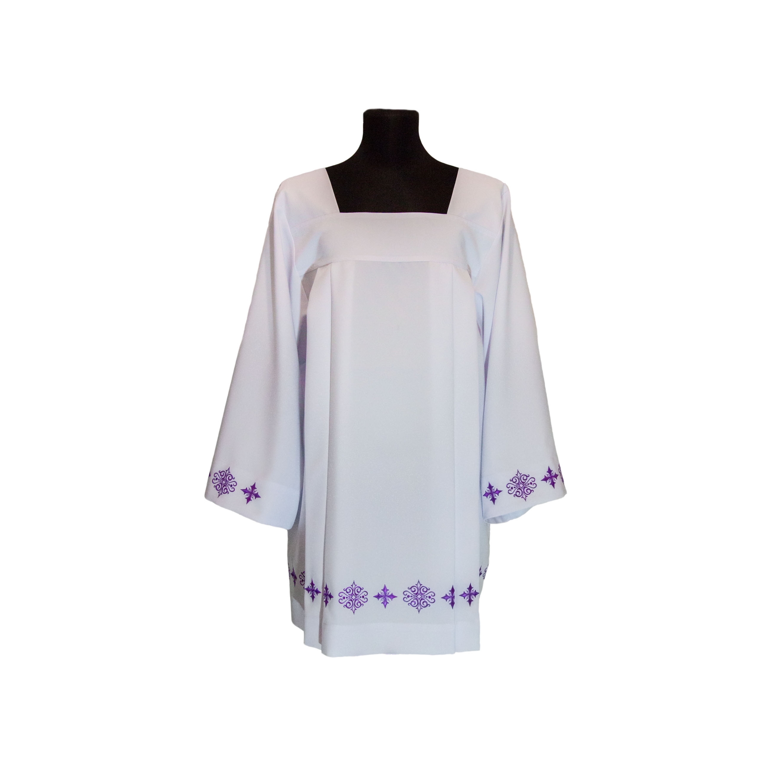 Krój rzymski z zaprasowanymi zakładkami. Przód i tył na dole ozdobione delikatnym, ażurowym haftem. Motyw haftu to ornament krzyża z rybami.