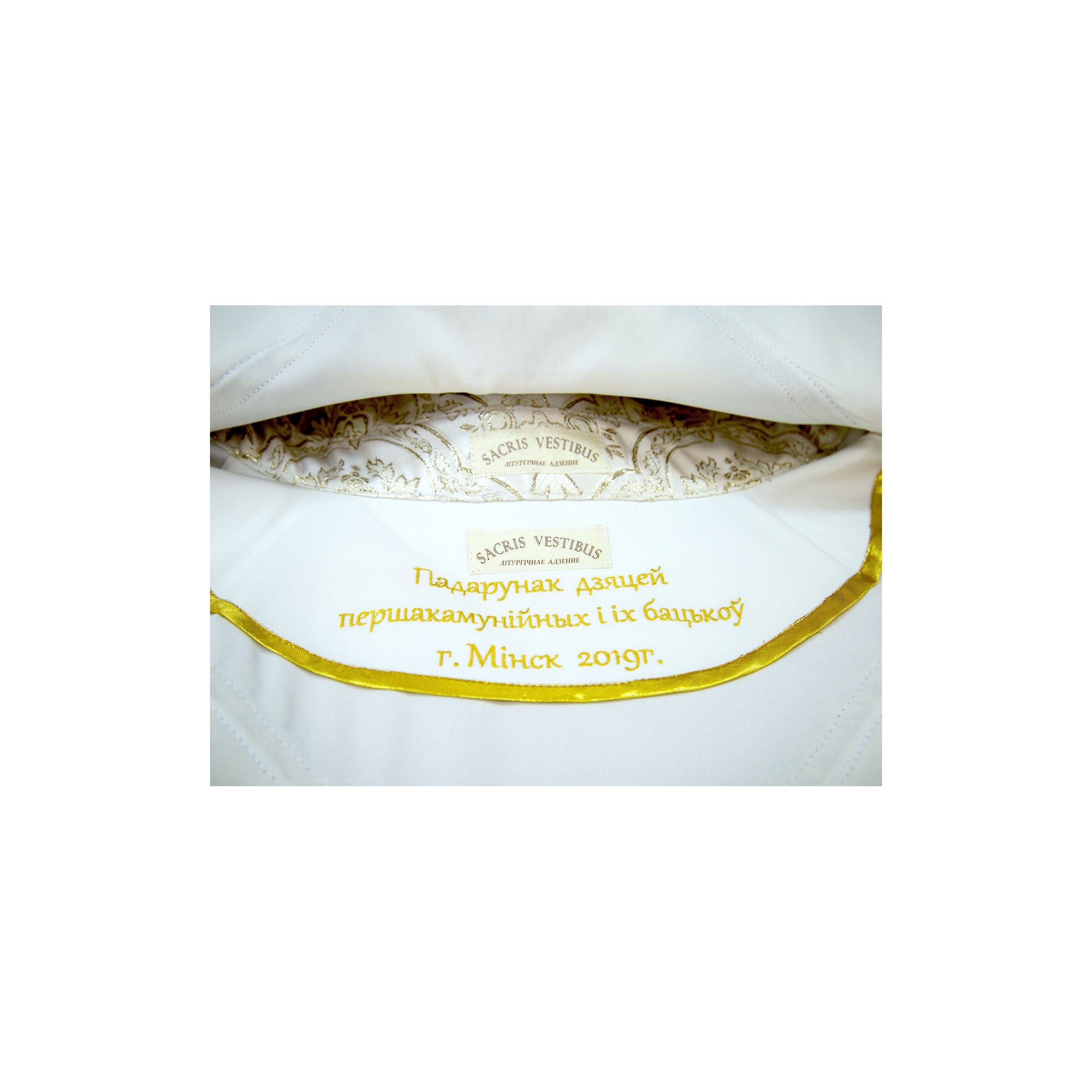 Ornat bez pasa w komplecie ze stułą wewnętrzną. Wzdłuż dolnej krawędzi oblamowany złotą taśmą.