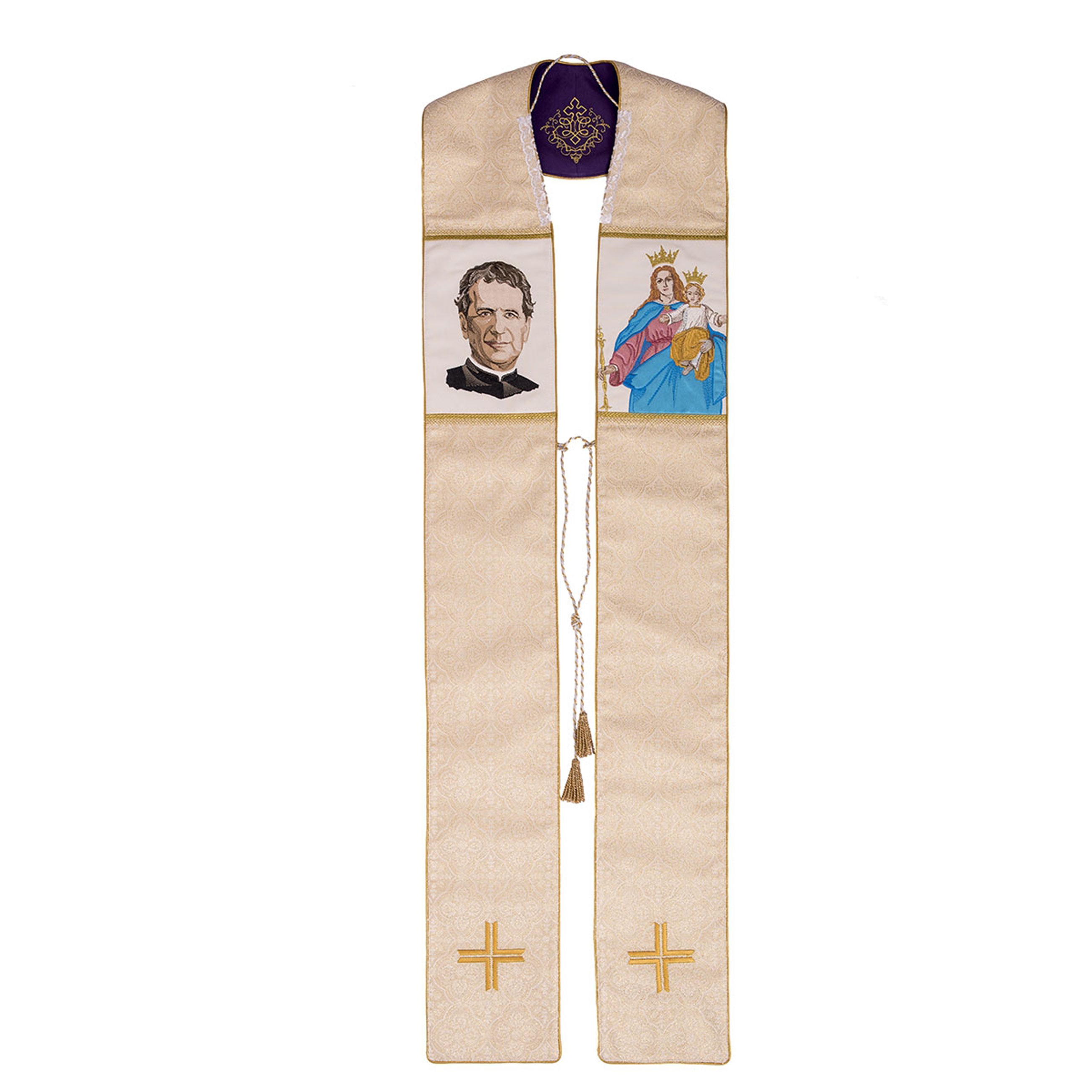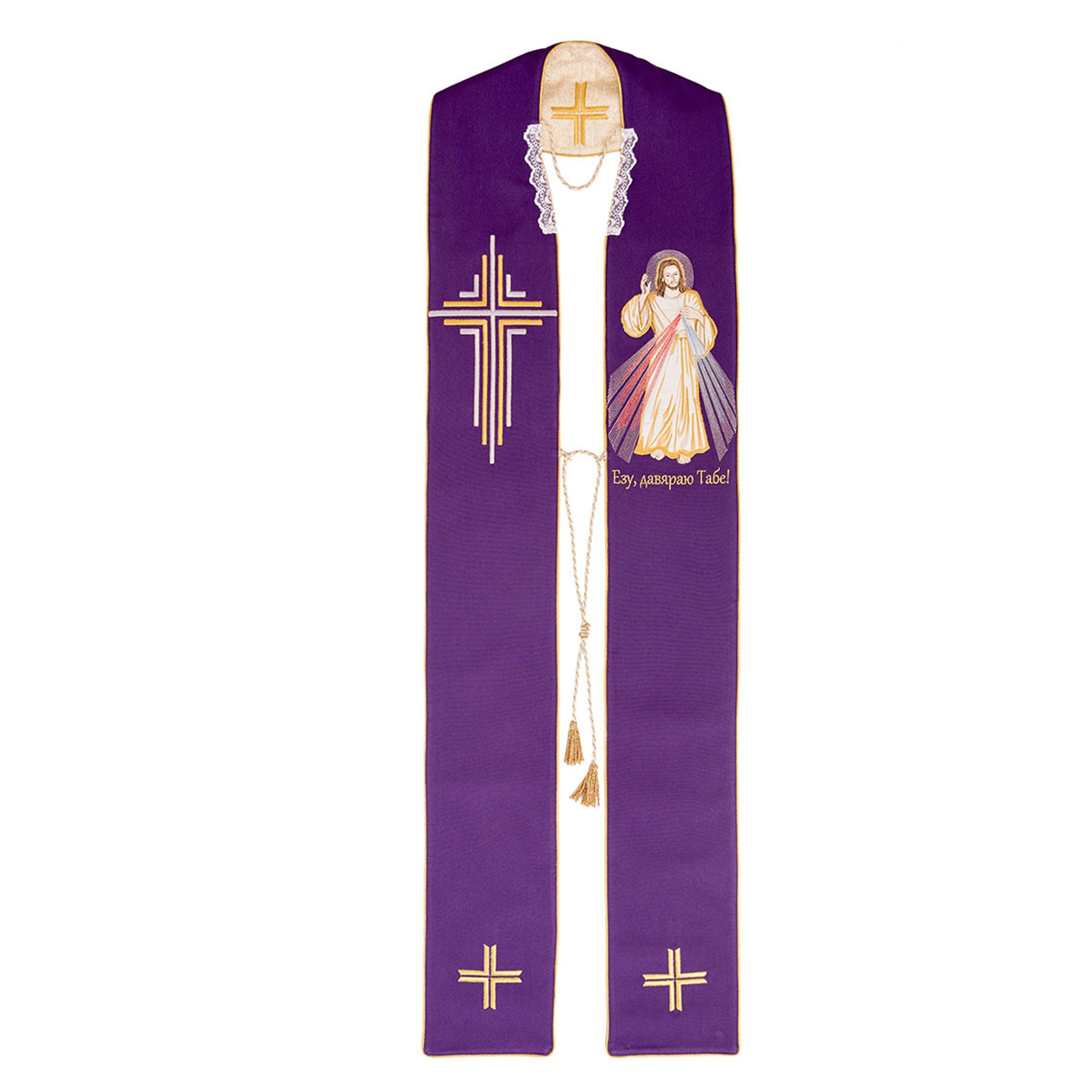 Stuła dwustronna, haftowana, z koronkowym kołnierzykiem, sczepiona złotym sznurkiem z frędzlami. Złociste oblamowanie krawędzi.