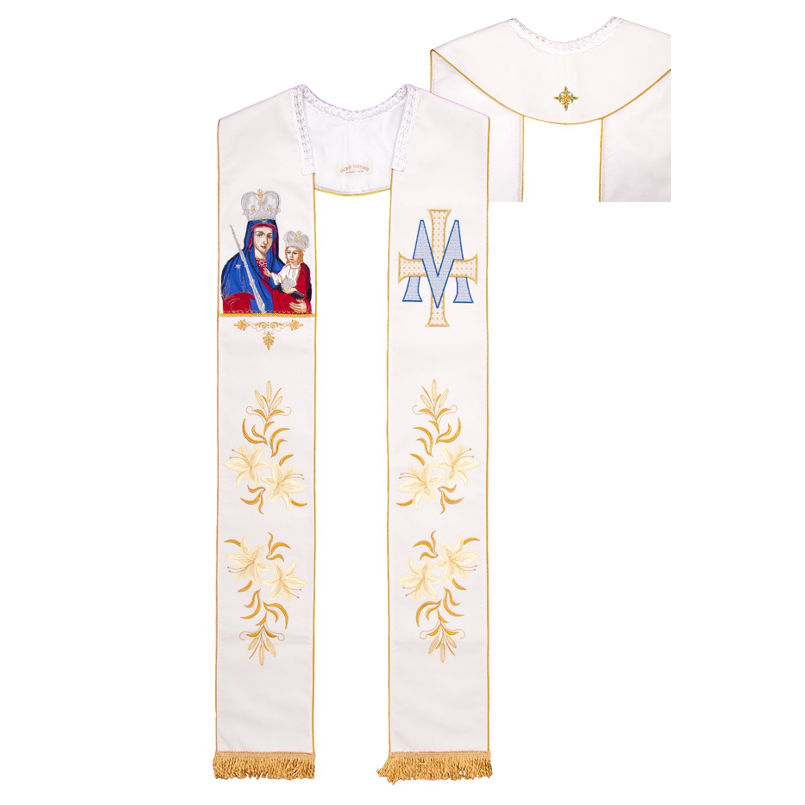 Stuła jednostronna haftowana. Wzdłuż krawędzi ozdobiona taśmą z niebieskiej satyny. Stułę wykończono złotymi frędzlami.