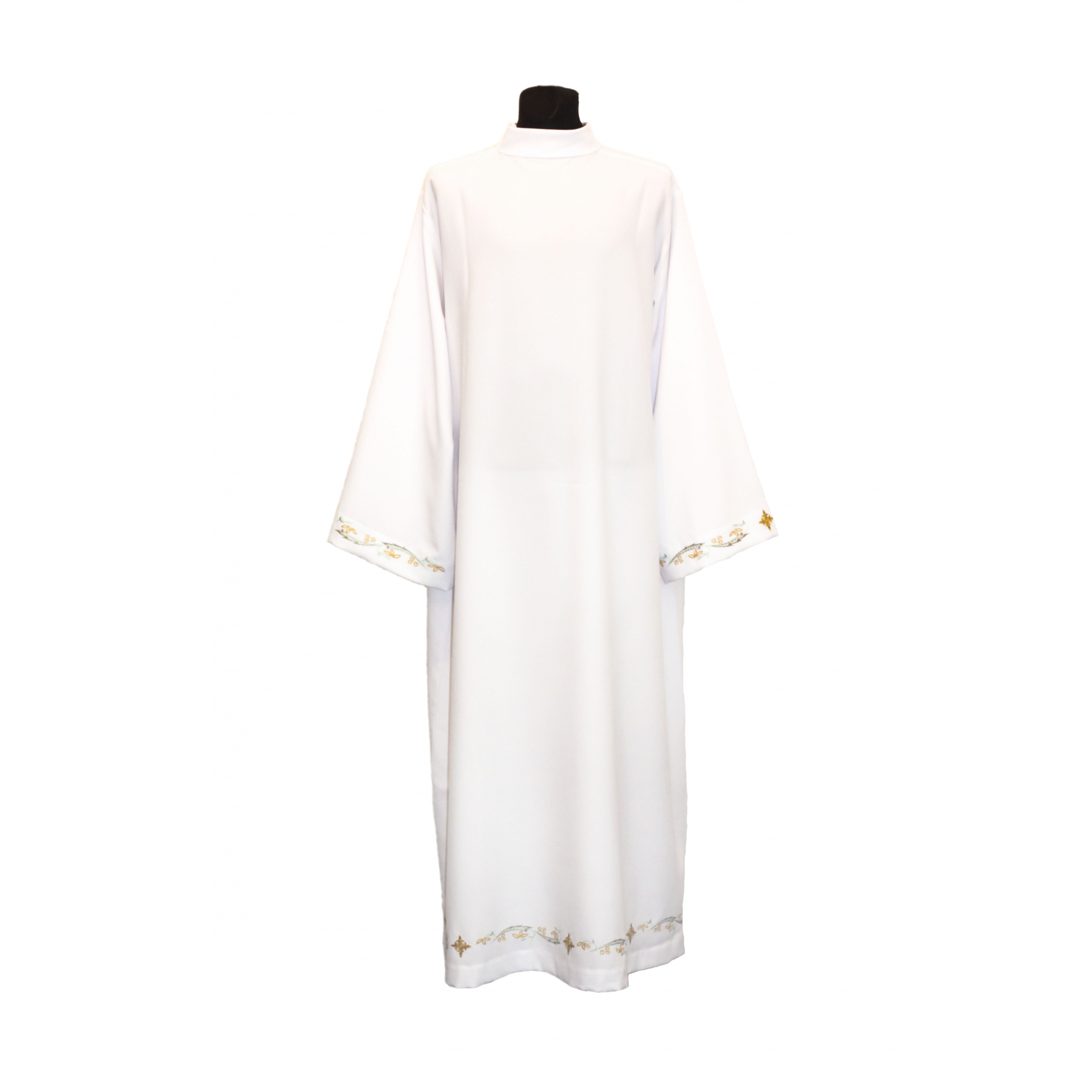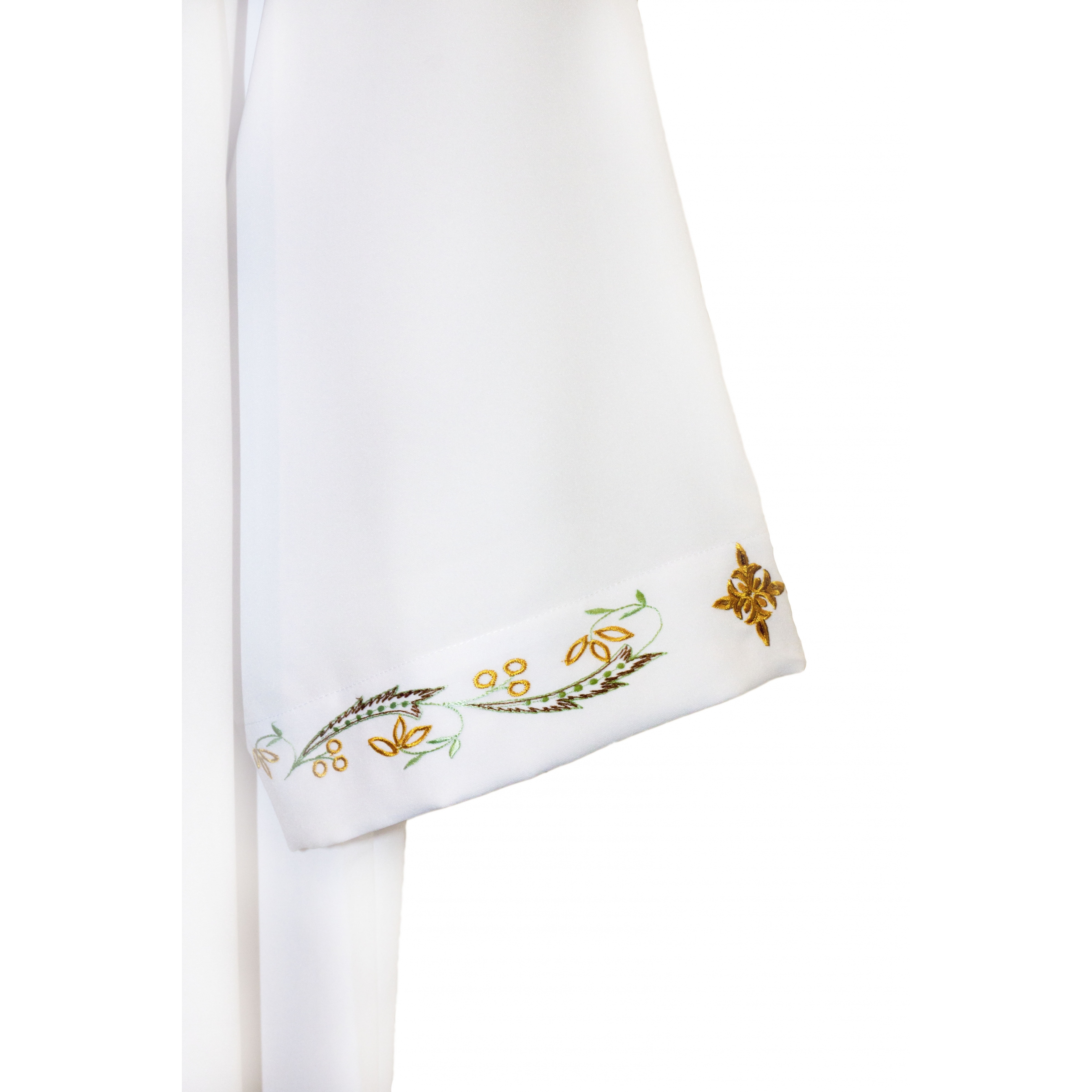 Альба без складок, с вышивкой. Воротник- стойка с застежкой на тесьму "молния" по плечевому шву. Для модели предусмотрен пояс.