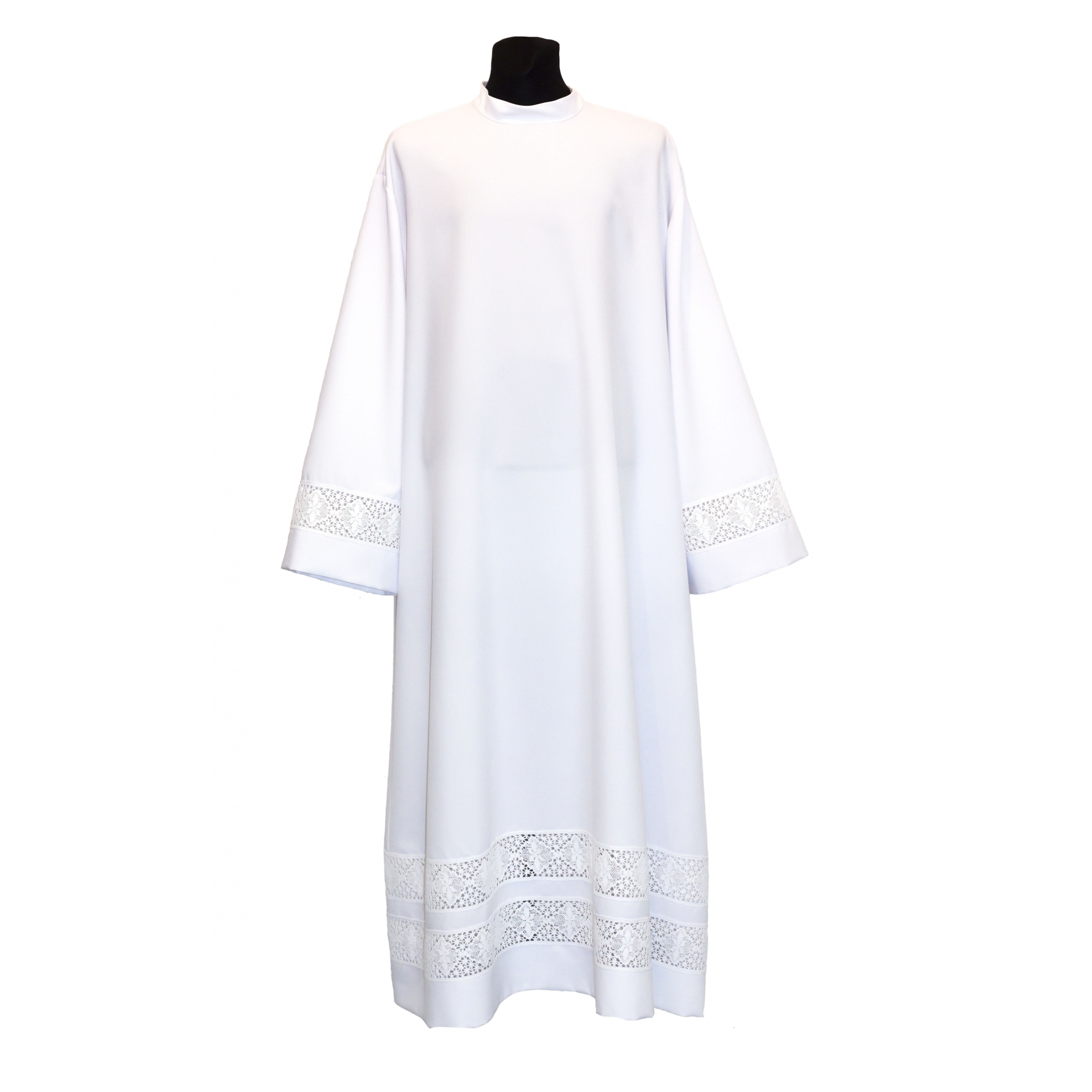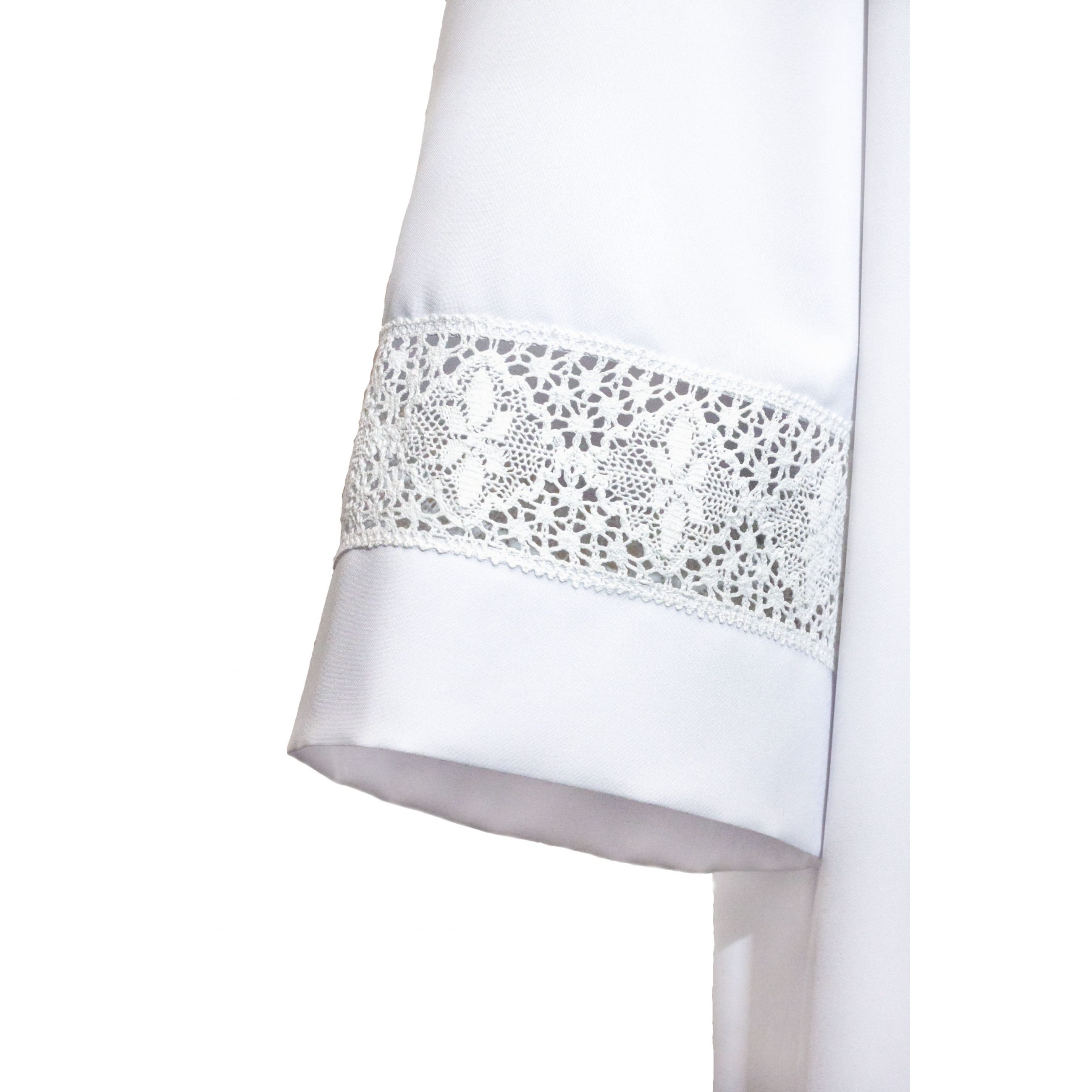 Альба без складок. Воротник - стойка, застежка молния по передней полочке. Низ изделия и рукава отделаны кружевом.