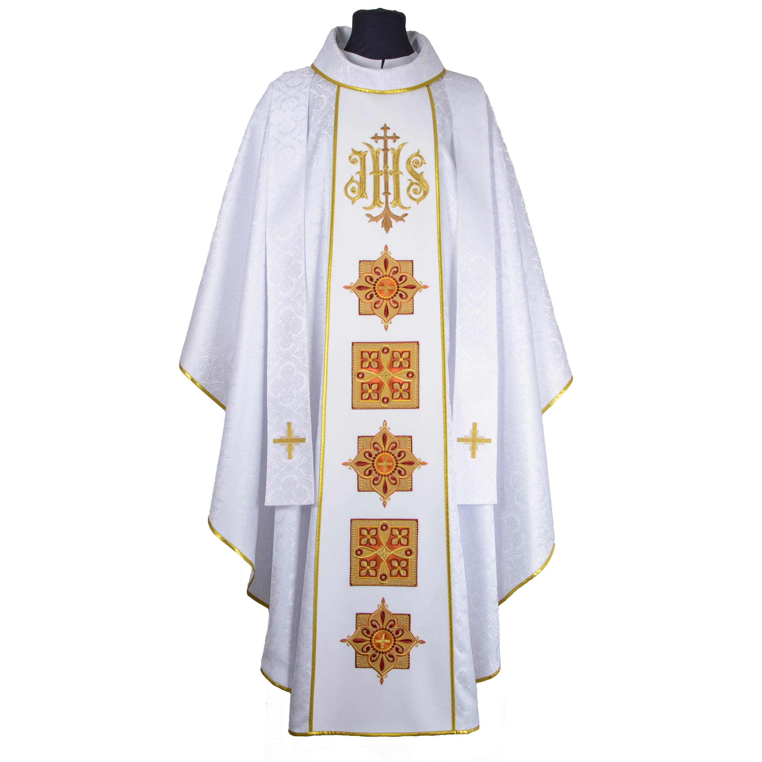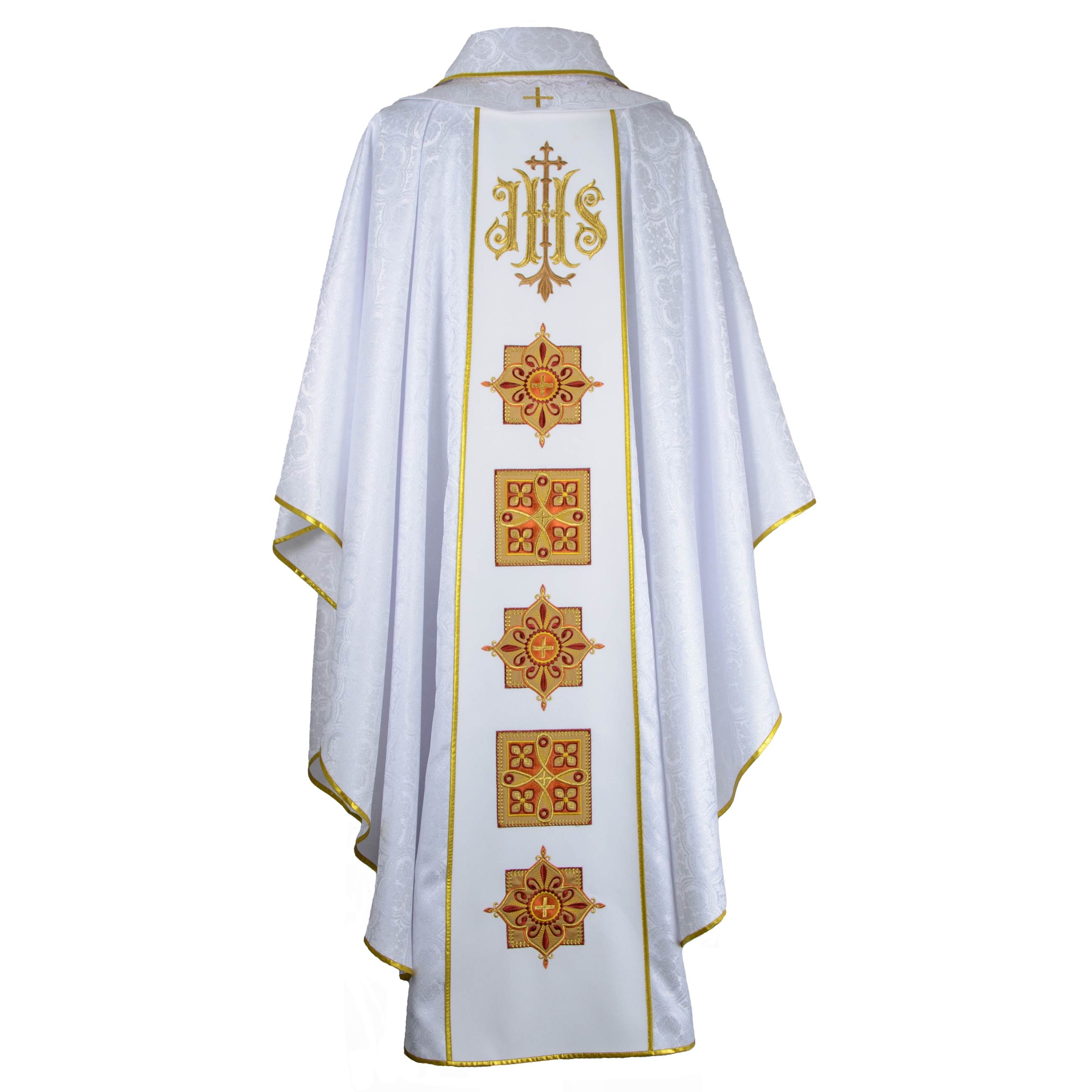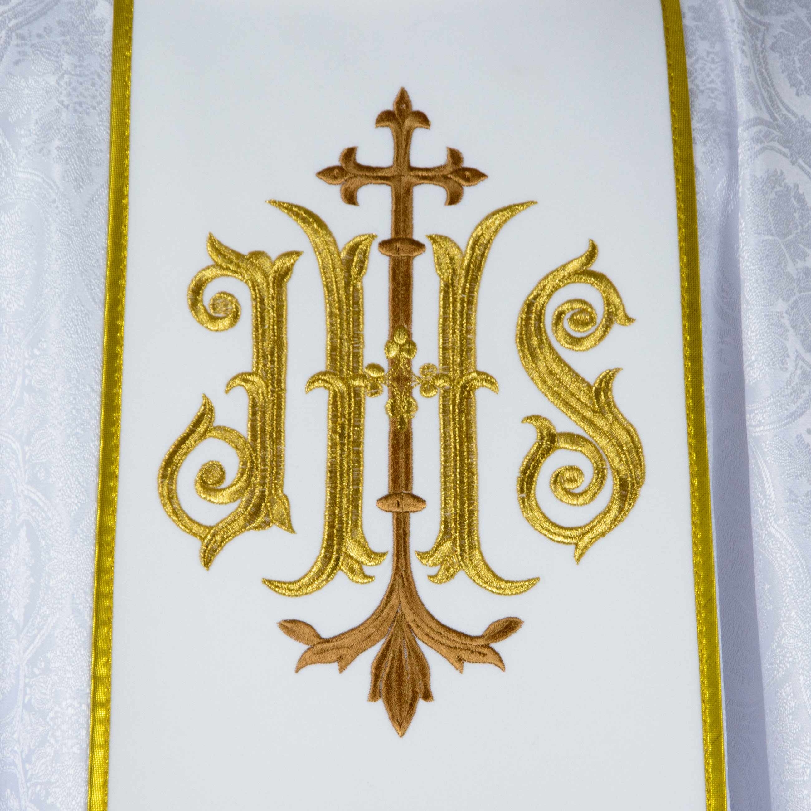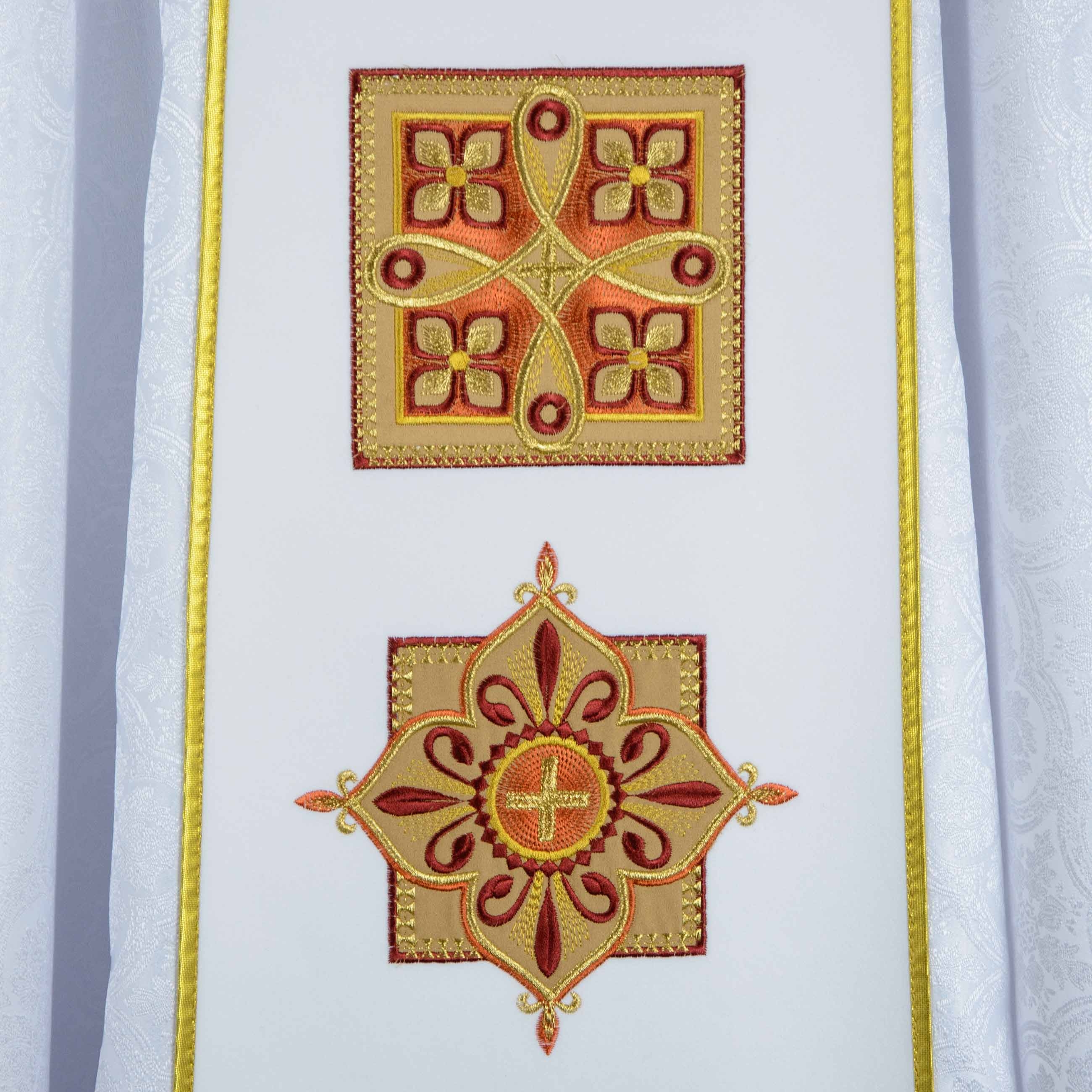Орнат выполнен из жаккардовой ткани серебристого цвета, отстрочен золотой тесьмой. Пояс из габардина украшен красивым узором, вышитым шелковой и металлической нитью.По индивидуальному заказу возможно изменение фасона, отделки, узора и рисунка.