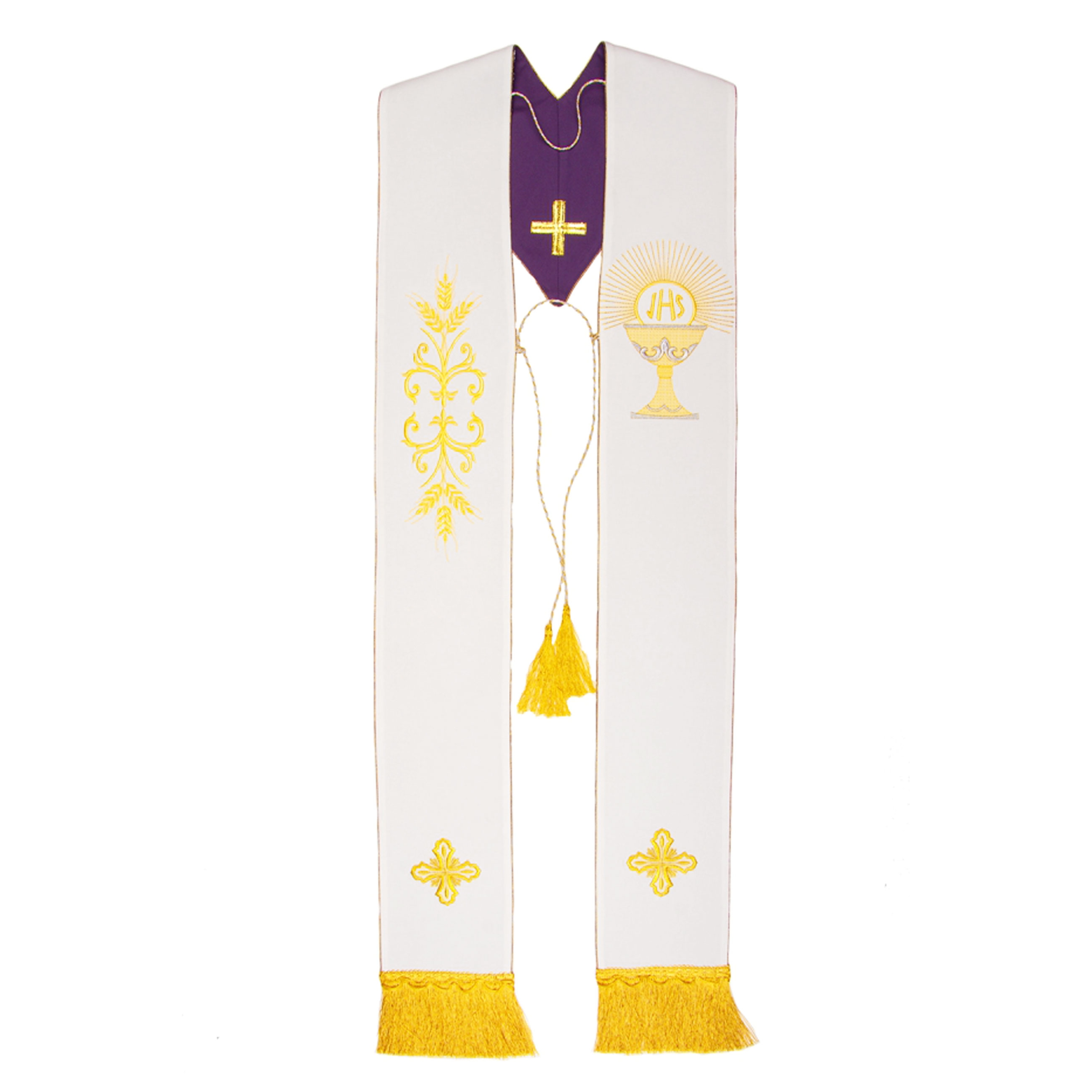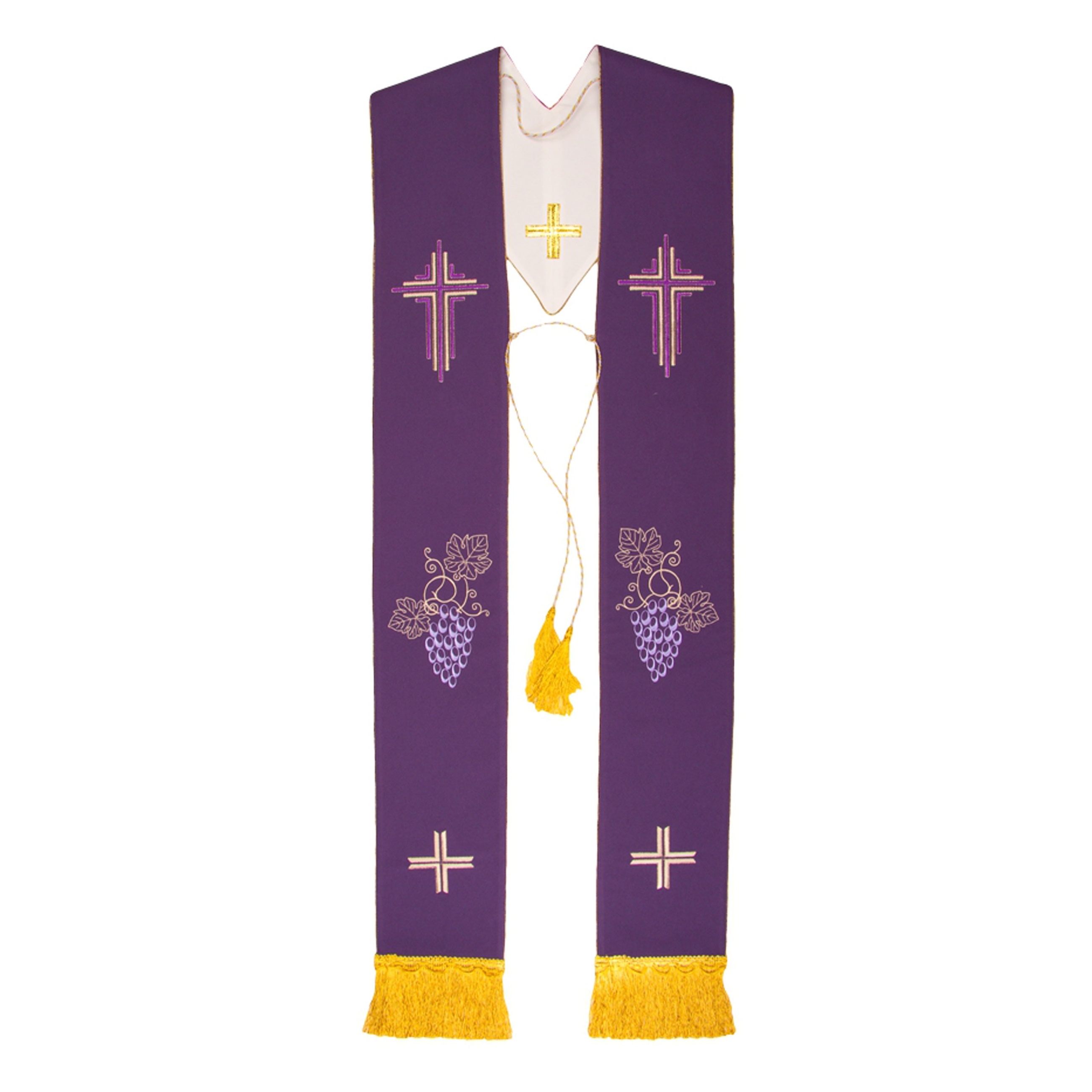 Двухсторонняя стола. Вышитый нарядный узор. Проложен золотистый кант по краю издерия, по горловине сзади - кружево. Сцеплена золотым шнуром с кистями. По низу изделия золотая узкая бахрома с кисточками.