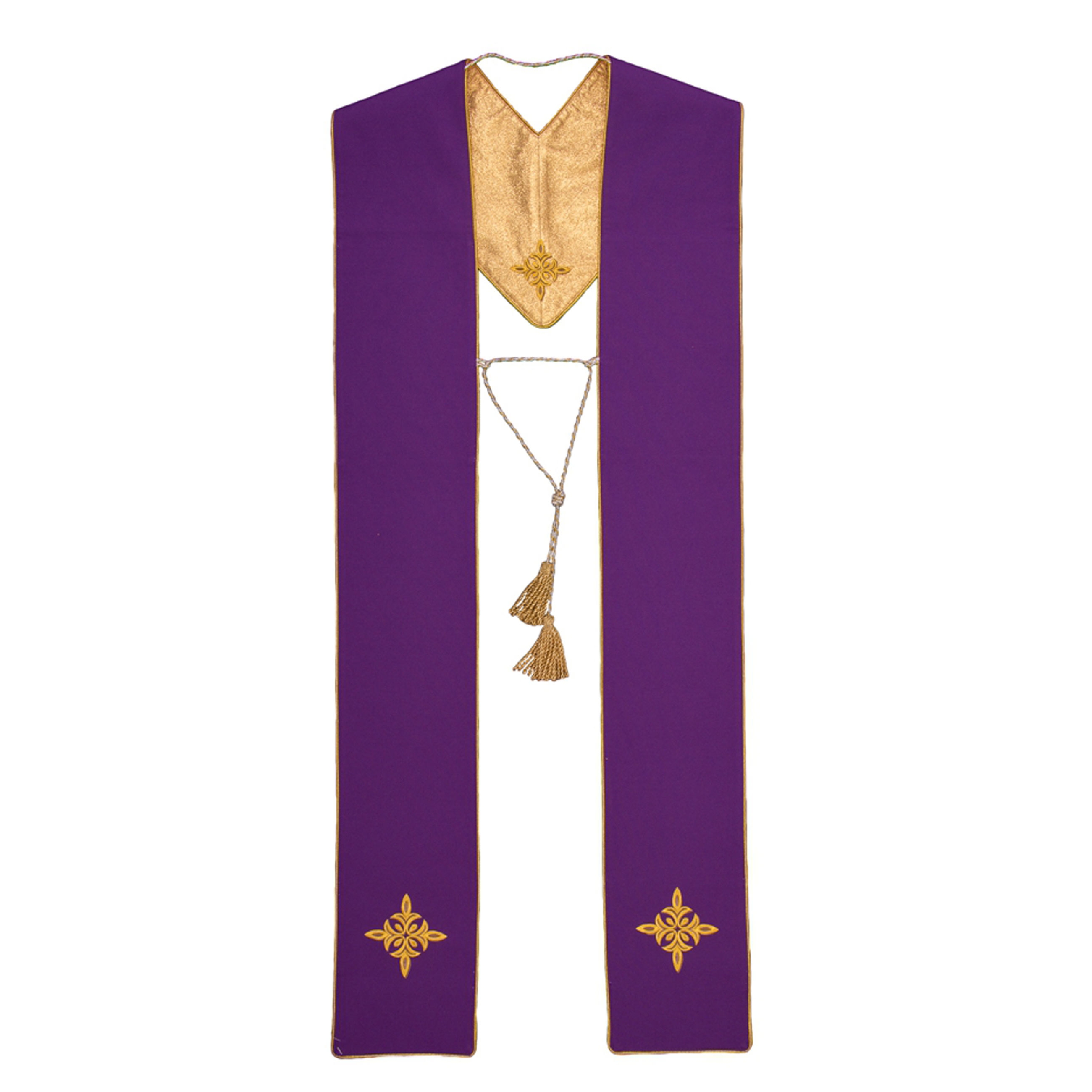 Двухсторонняя стола. Вышитый нарядный узор. Проложен золотистый кант по краю издерия, по горловине сзади - кружево. Сцеплена золотым шнуром с кистями.