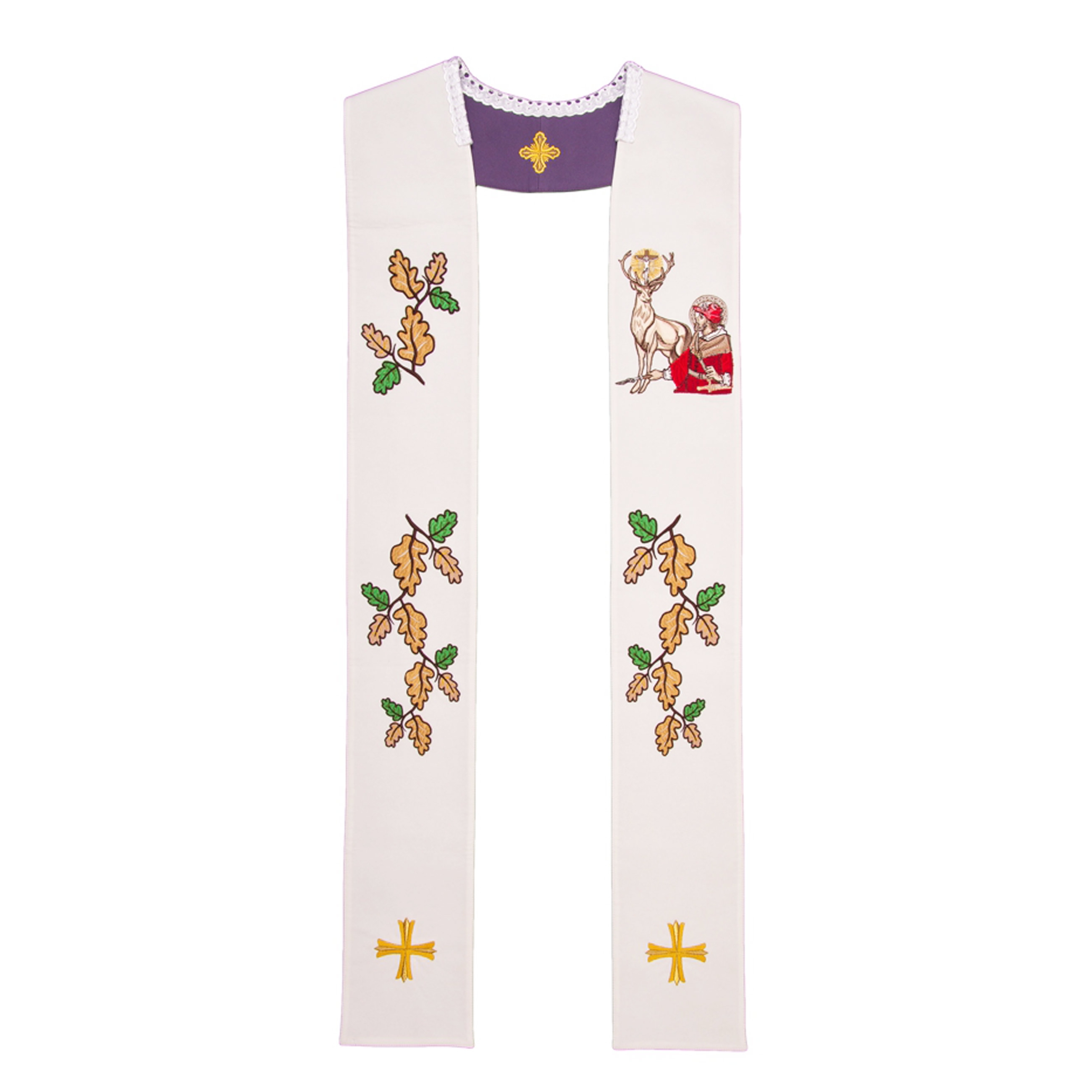 Двухсторонняя стола. Вышитый нарядный узор. Проложен золотистый кант по краю издерия, по горловине сзади - кружево.