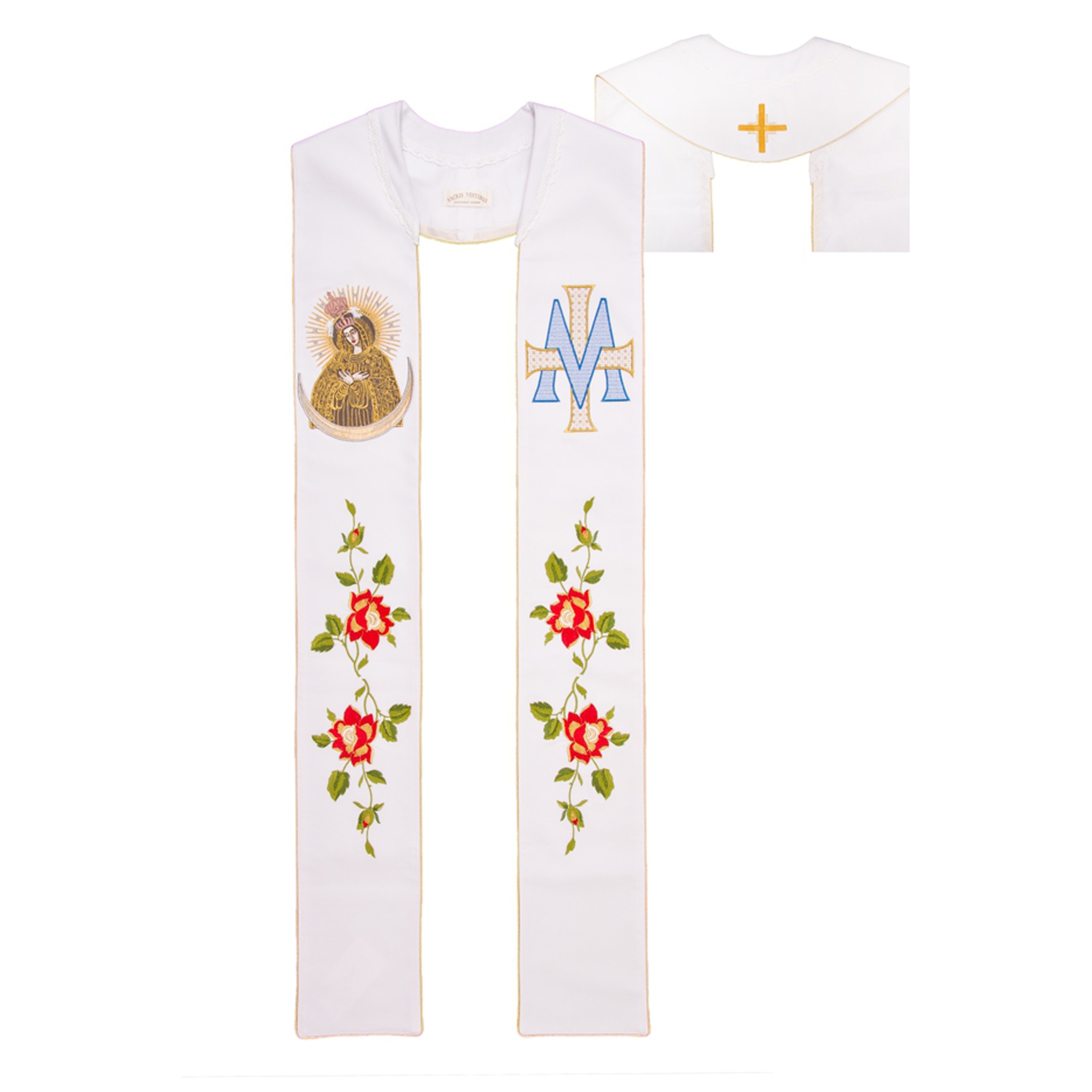 Белая односторонняя стола. Вышитый нарядный узор. Края изделия обработаны голубой атласной тесьмой.
