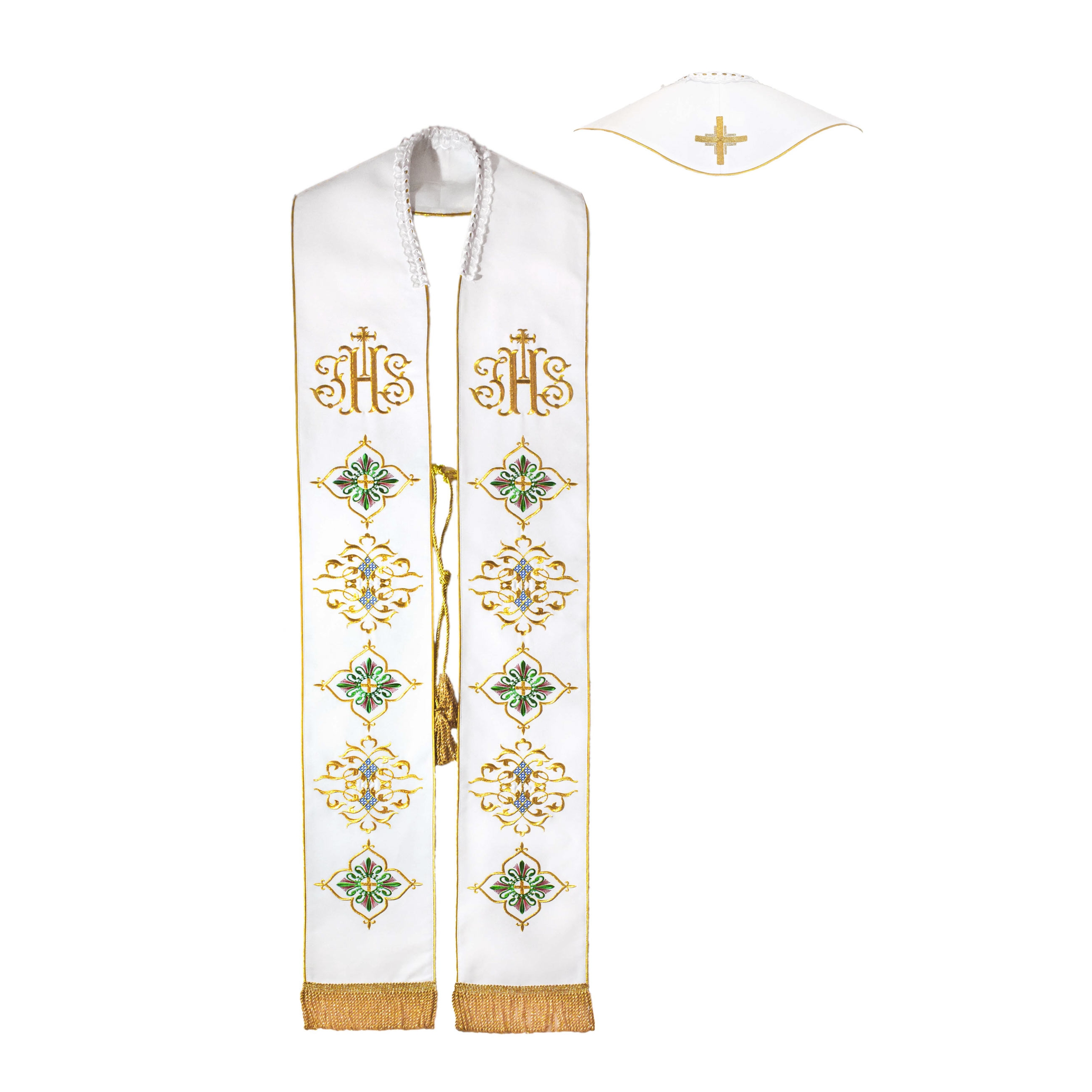 Стола односторонняя, угловая. Изделие отделано золотой тесьмой. На горловине сзади тесьма.