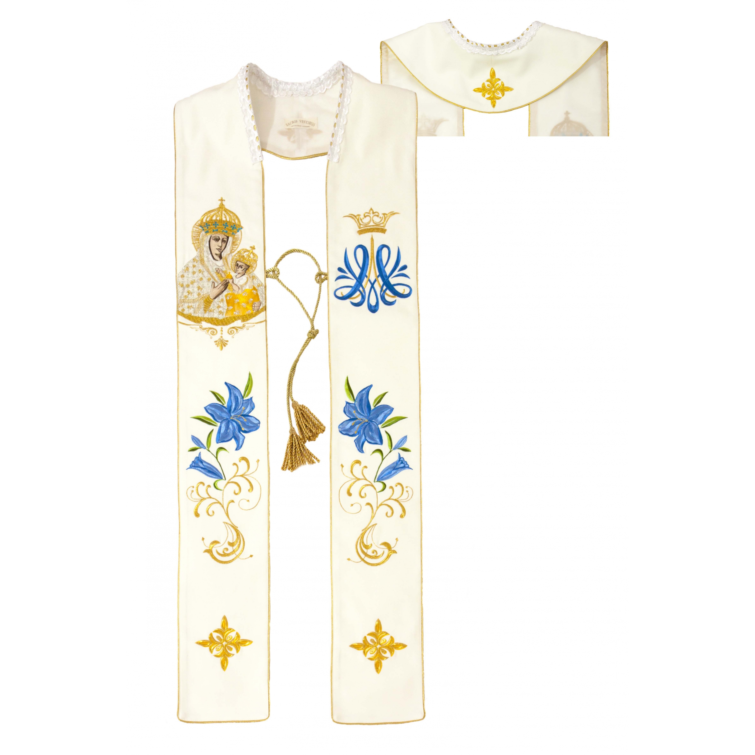 Белая односторонняя стола. Вышитый нарядный узор. Края изделия обработаны золотойатласной тесьмой.
