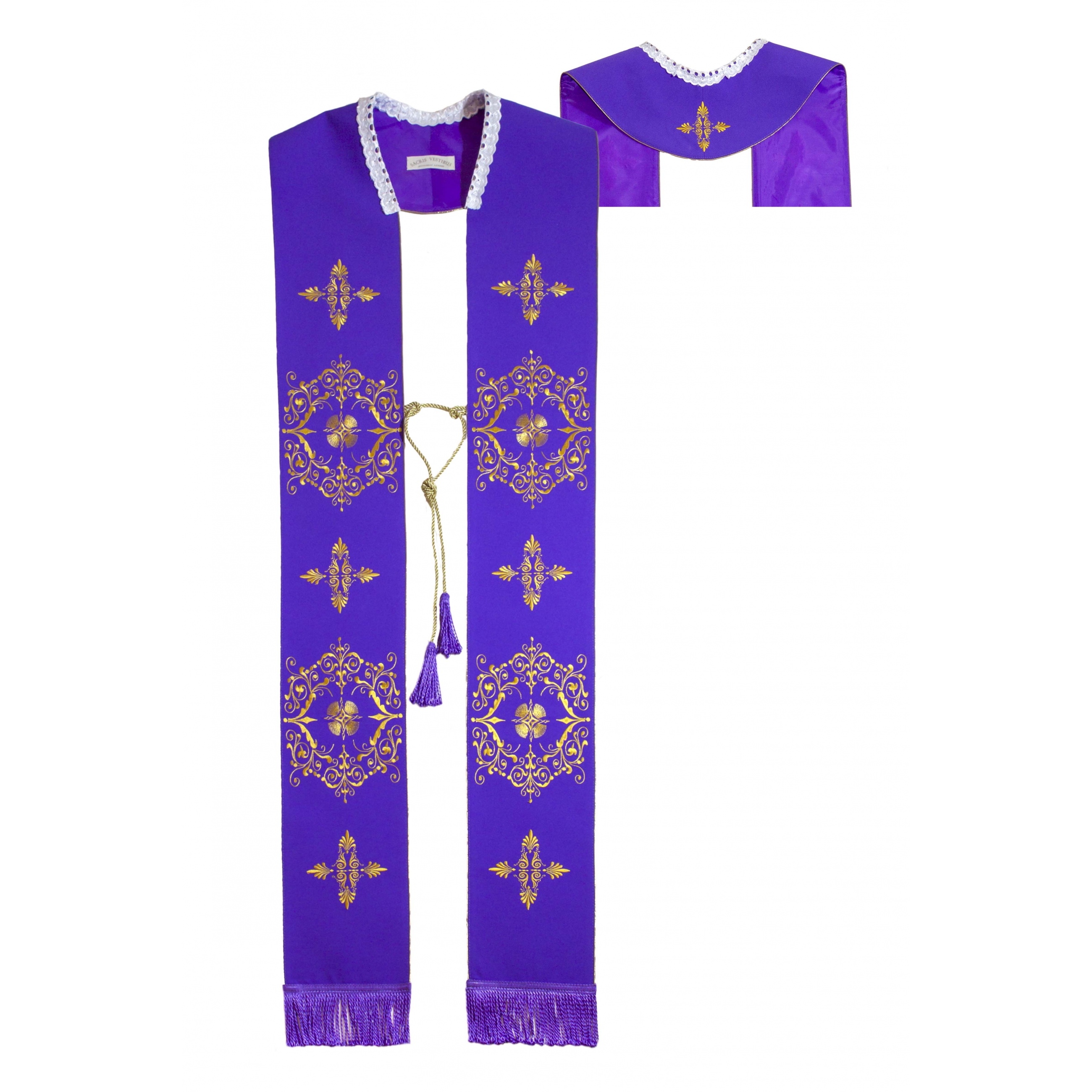 Одностороняя стола. Вышитый нарядный узор. По горловине сзади - кружево. Сцеплена золотым шнуром с кистями. По низу изделия фиолетовая широкая бахрома.