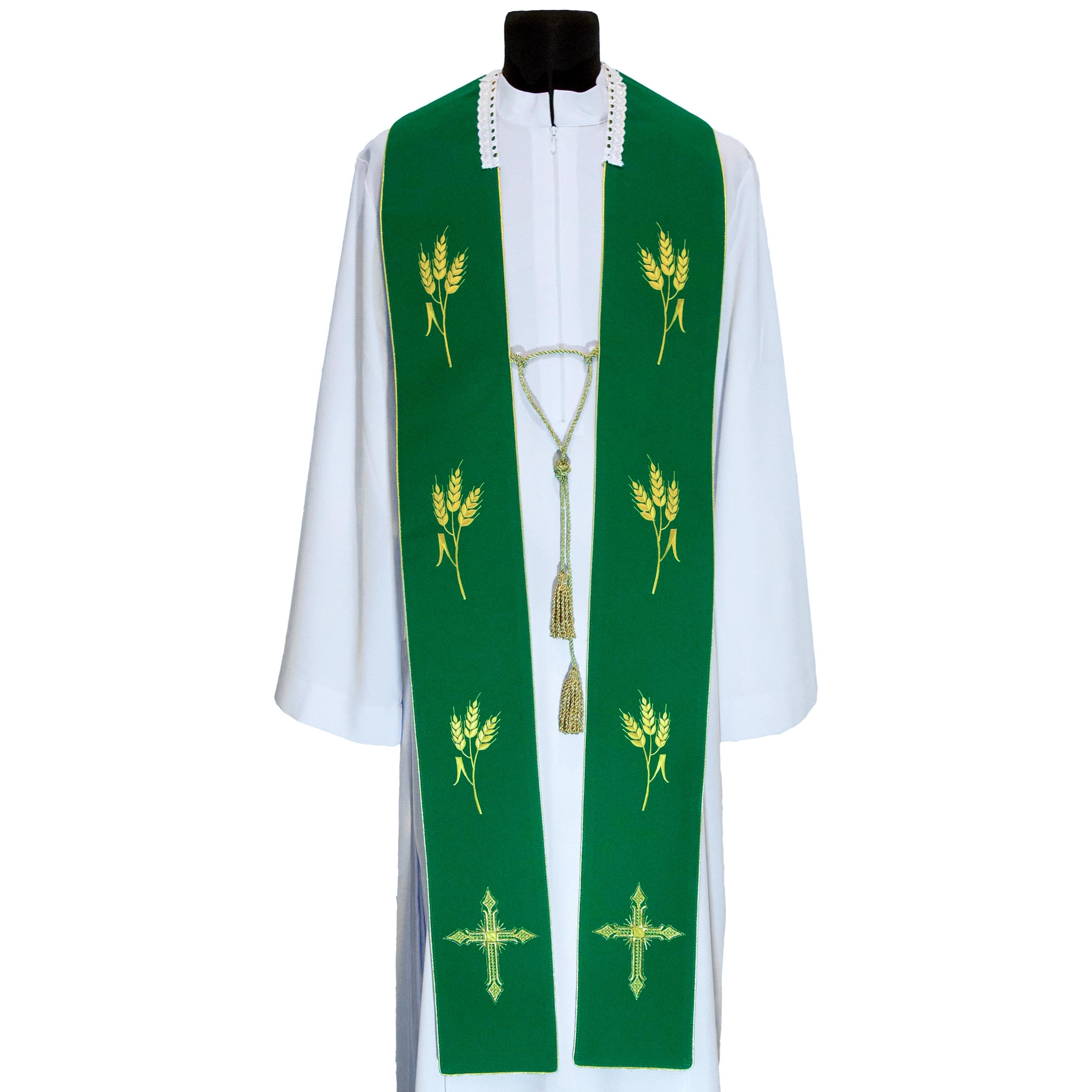 Одностороняя стола. Вышит нарядный узор. По горловине сзади - кружево. Сцеплена золотым шнуром с кистями. По низу изделия широкая бахрома.