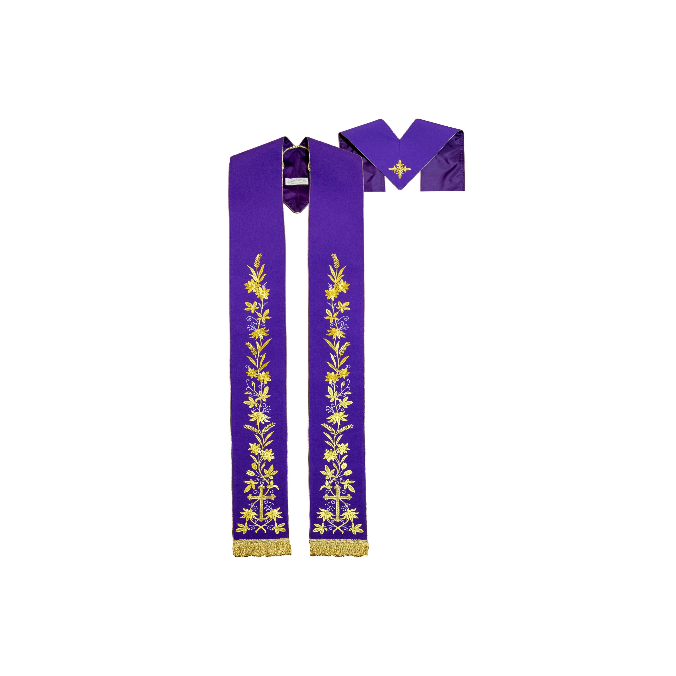 Односторонняя угловая стола. Проложен золотистый кант по краю изделия, широкая золотая бахрома по низу изделия, по горловине сзади золотой шнур.