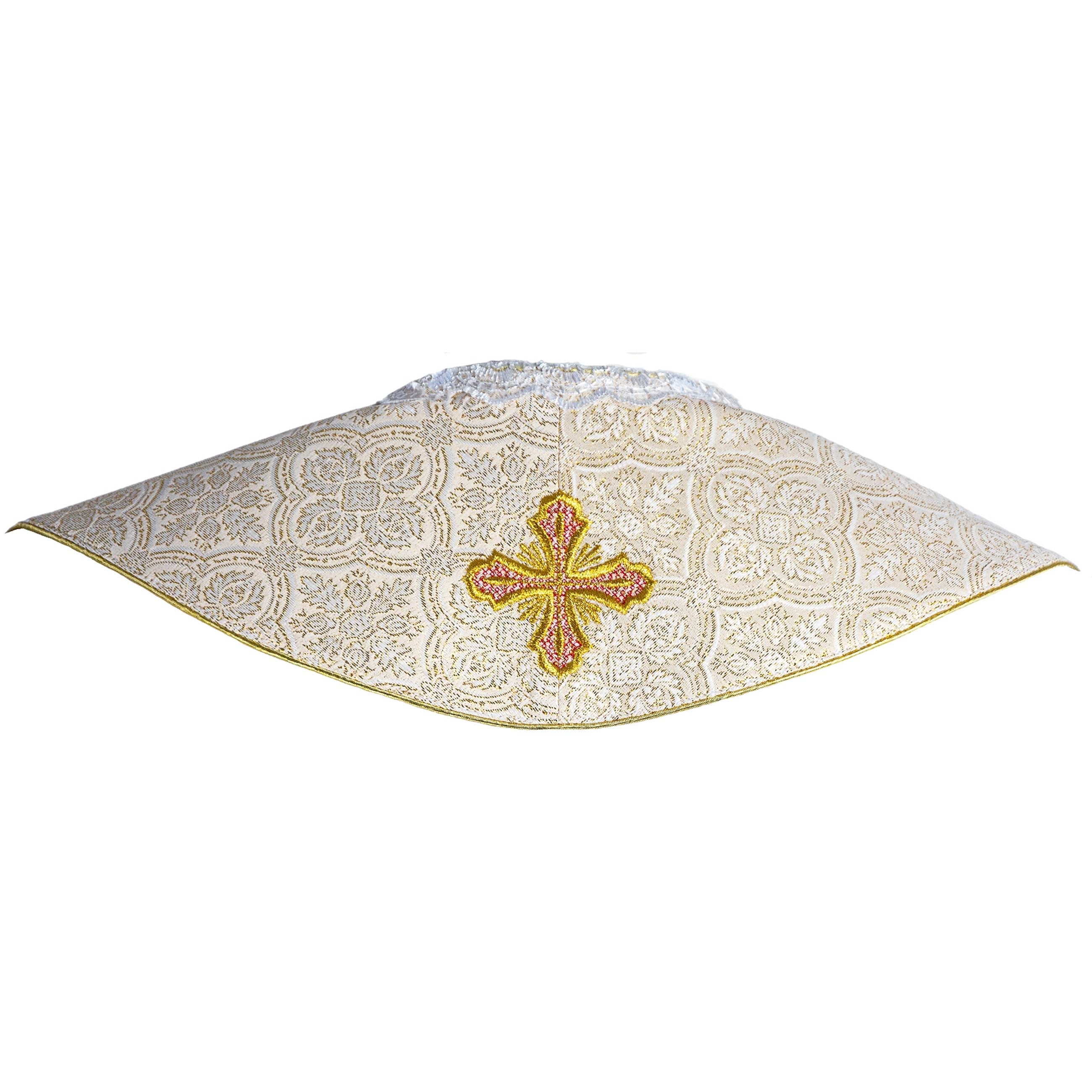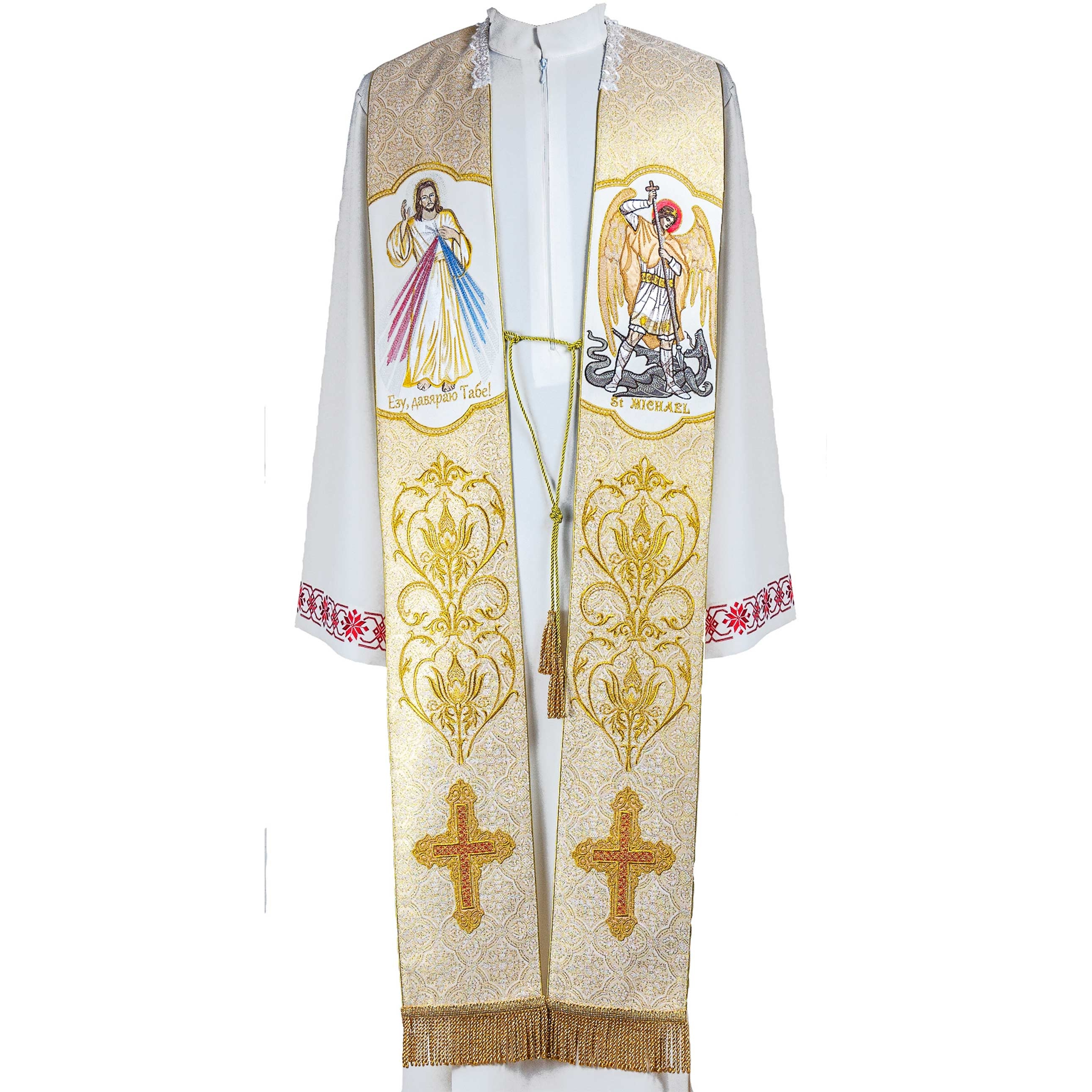 Белая односторонняя стола. Вышит нарядный узор. Края изделия обработаны голубой атласной тесьмой.