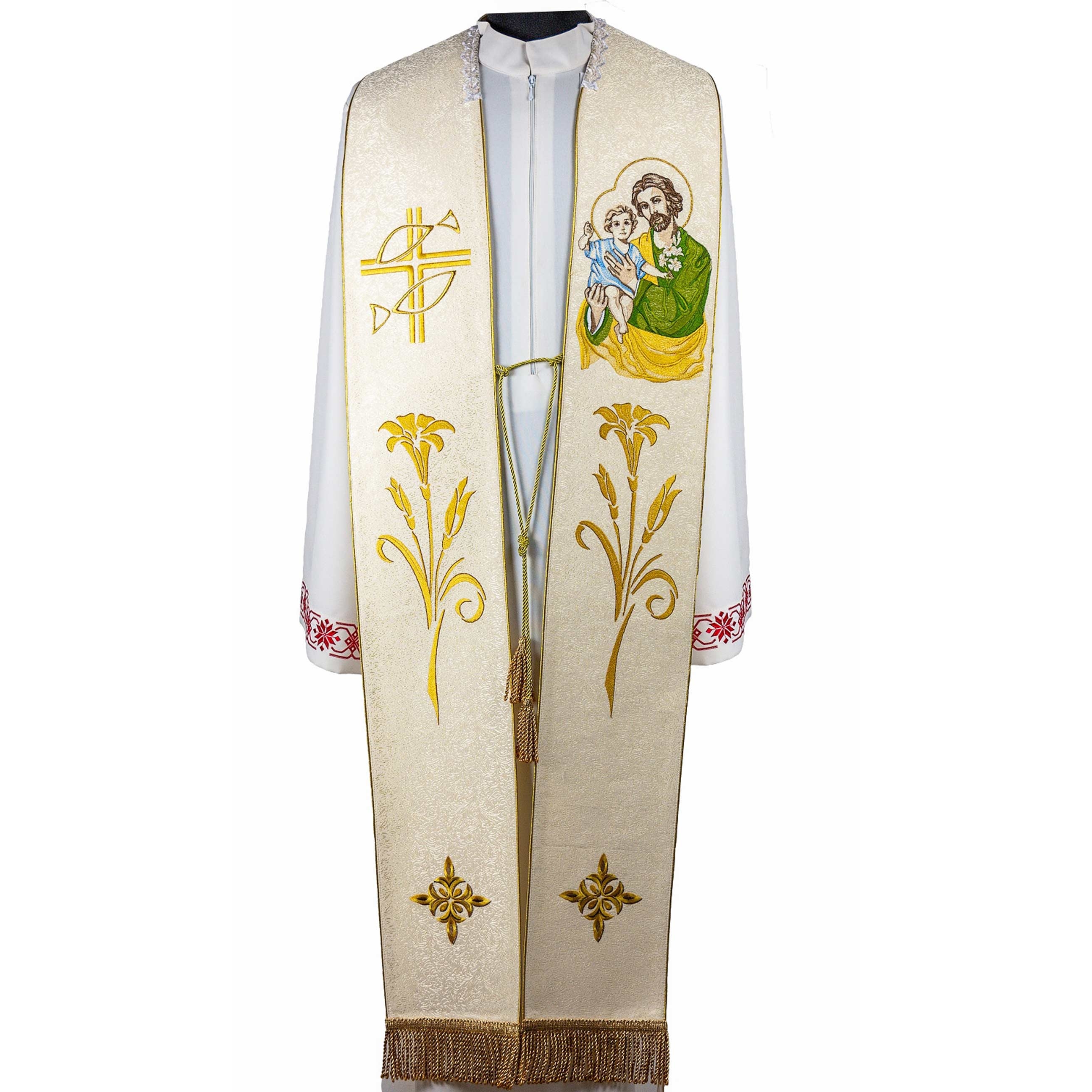 Белая односторонняя стола. Вышит нарядный узор. Края изделия обработаны голубой атласной тесьмой.