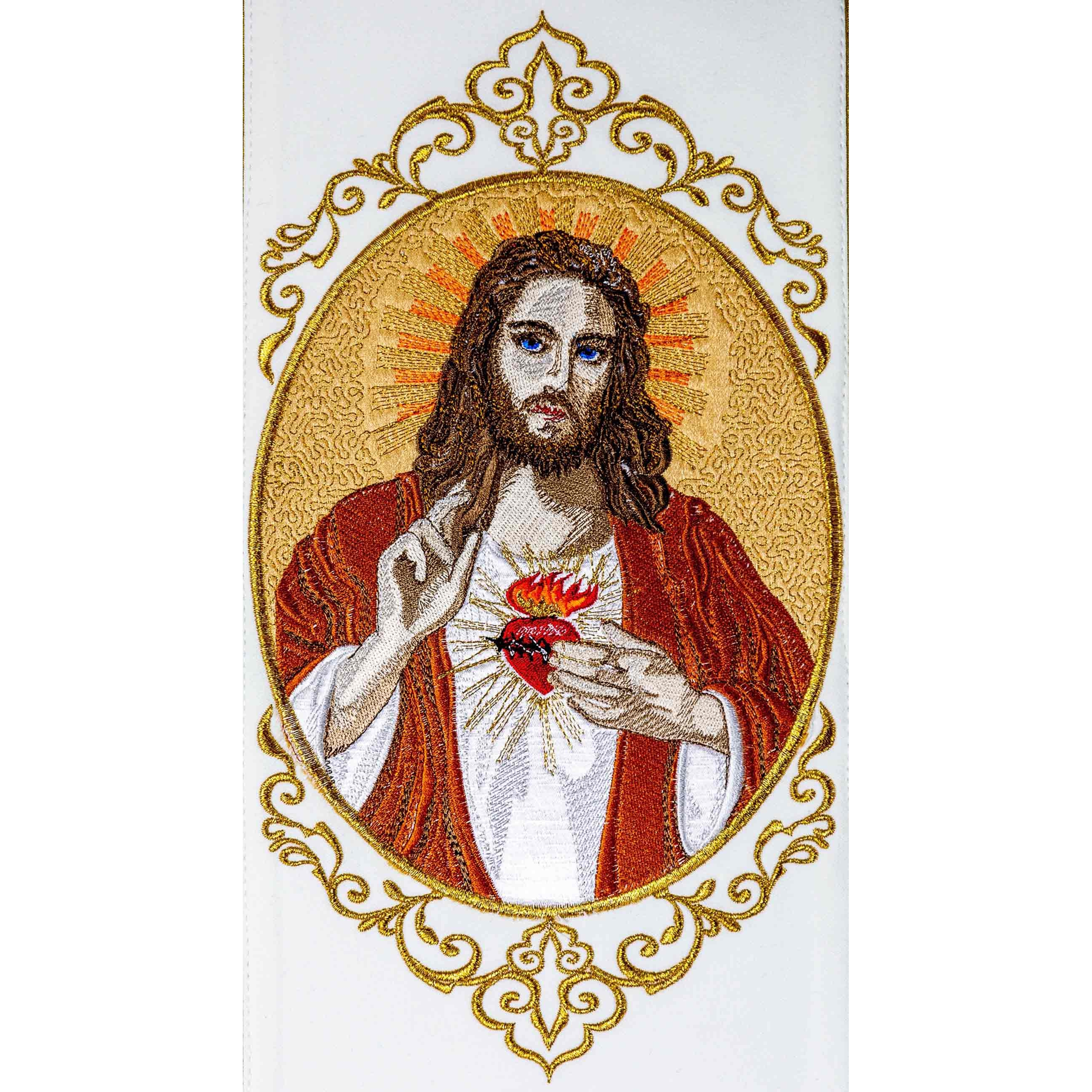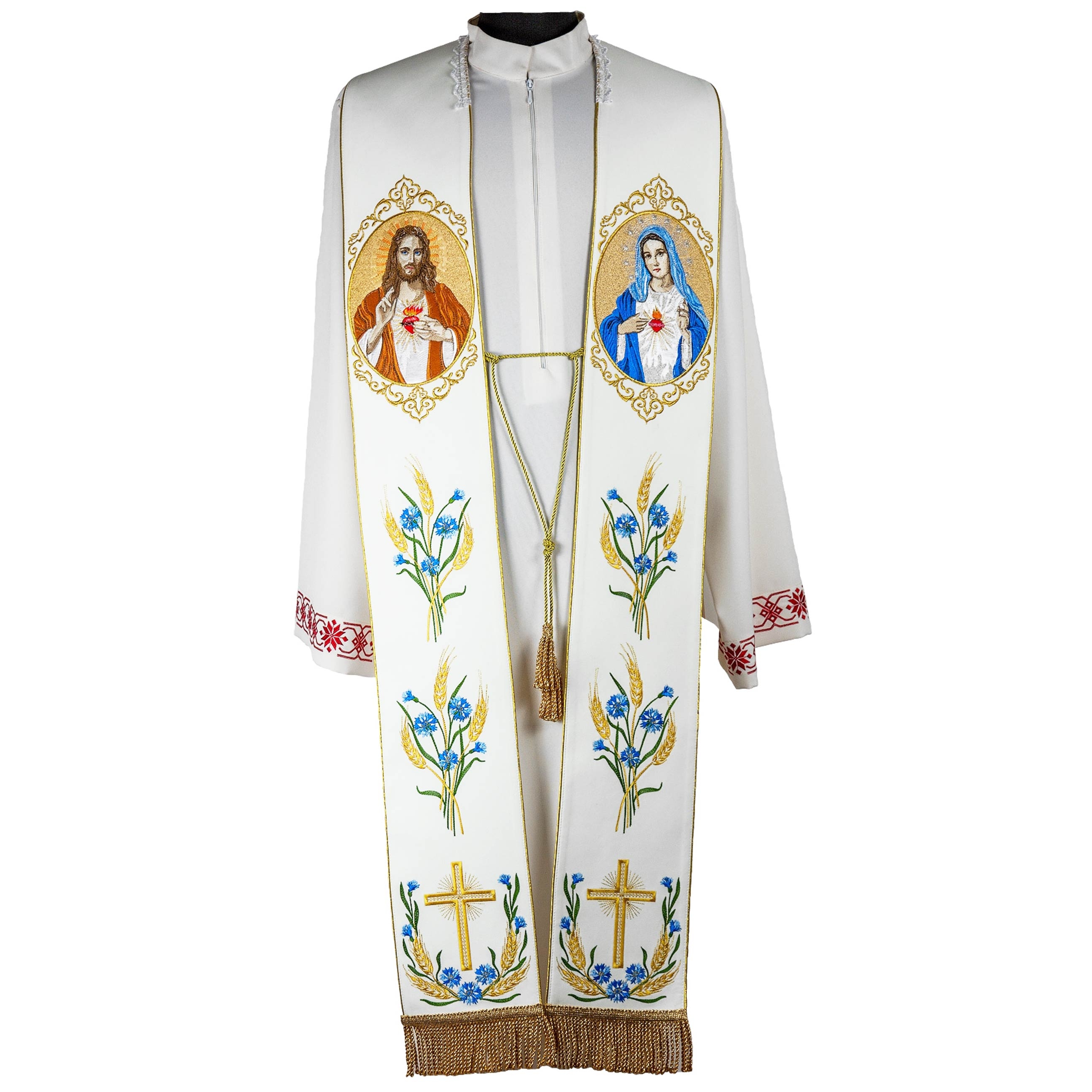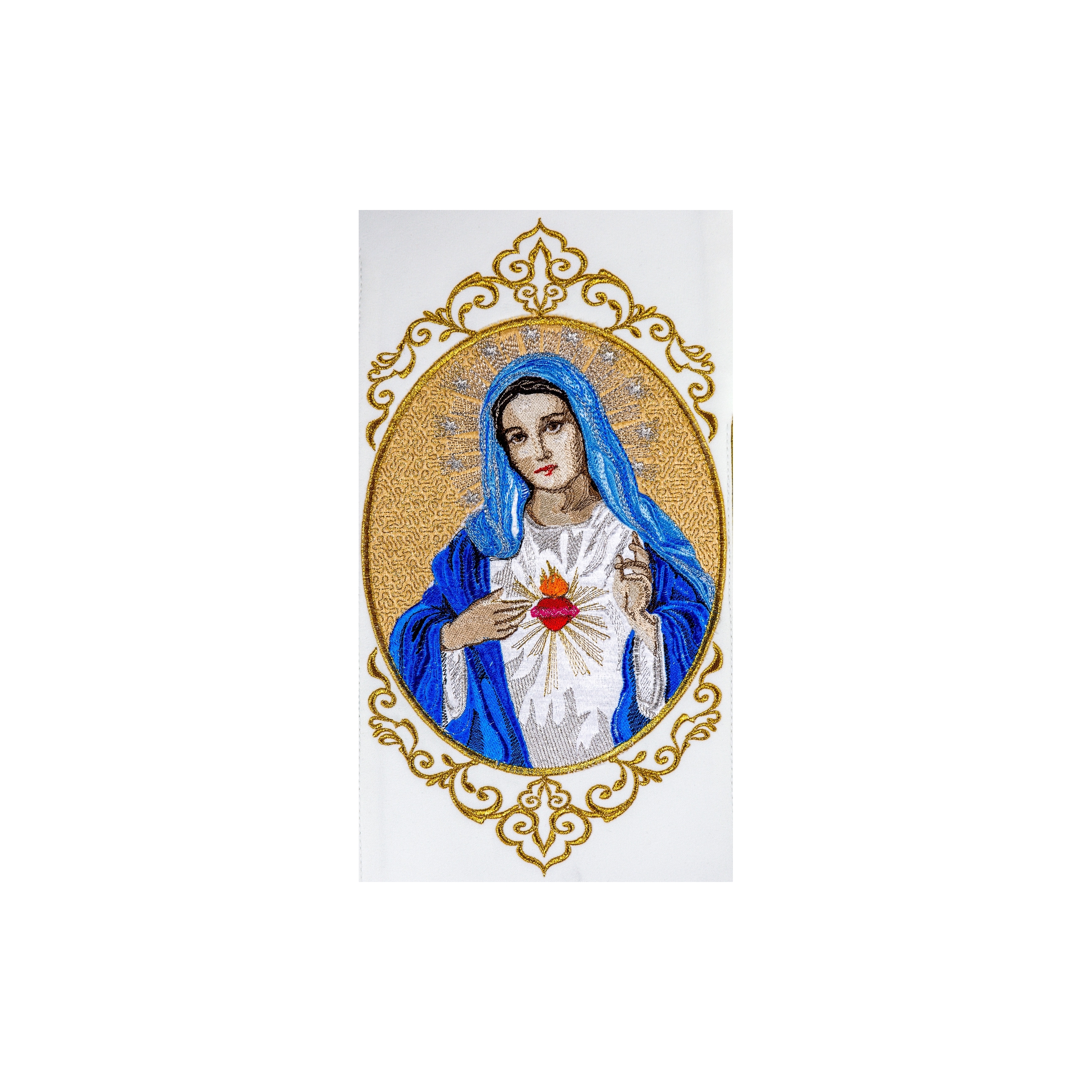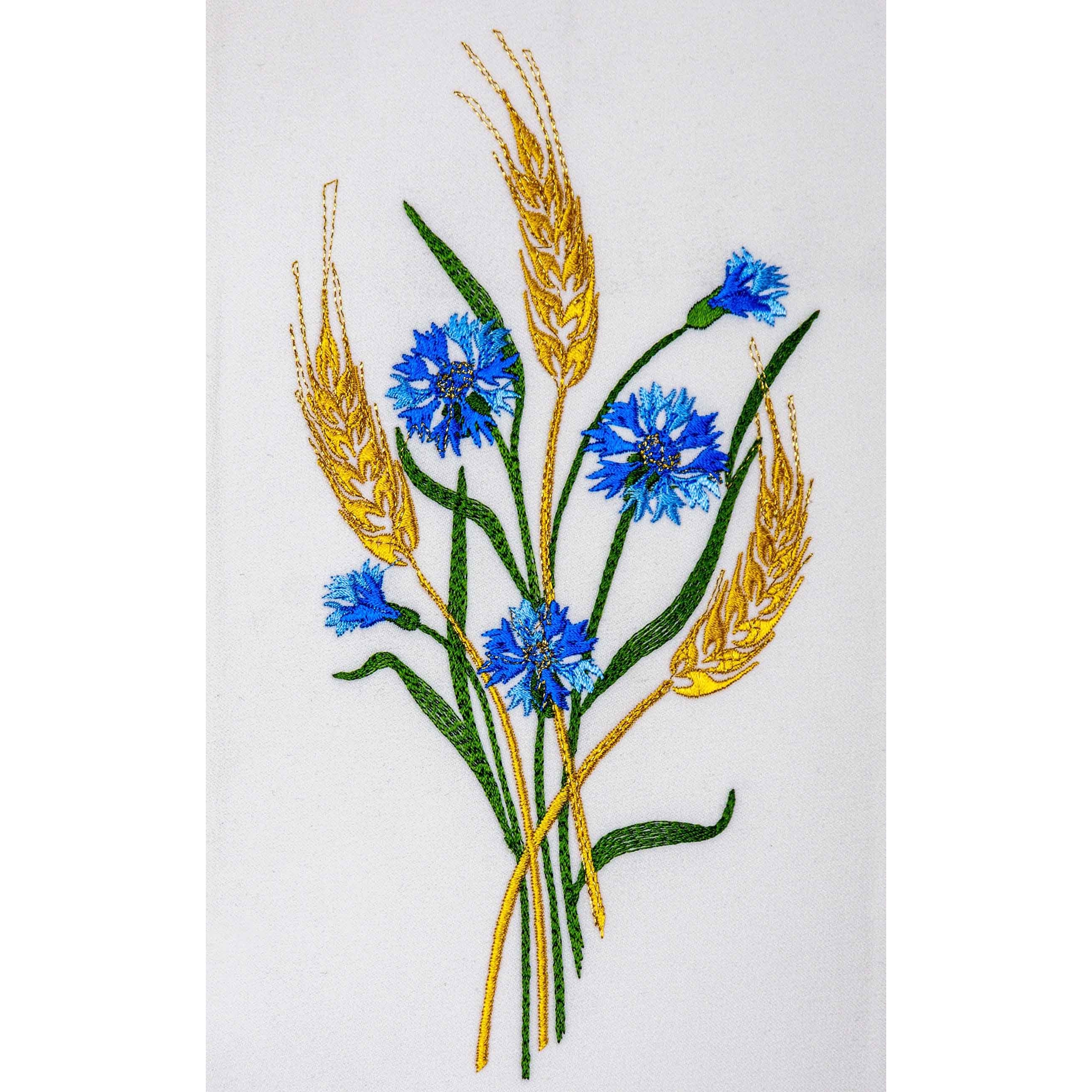 Белая односторонняя стола. Вышит нарядный узор. Края изделия обработаны атласной тесьмой.