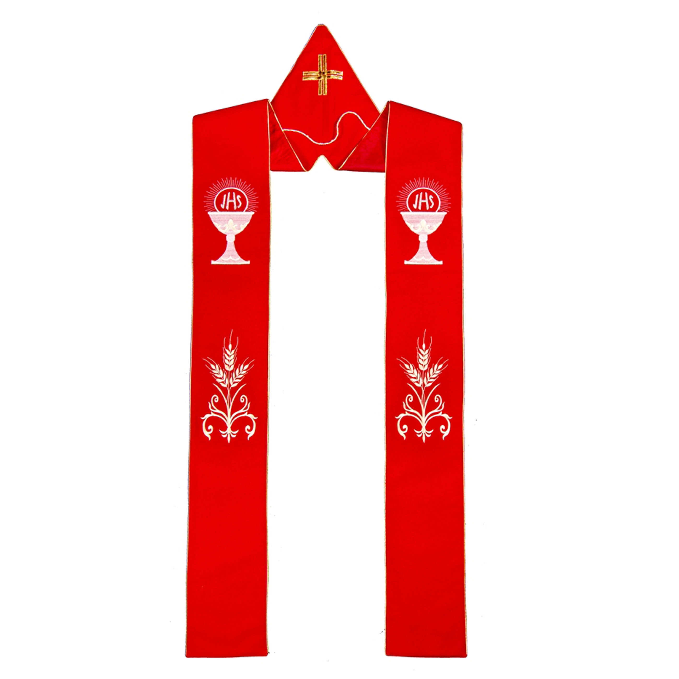 Односторонняя угловая стола. Вышитый узор. Проложен золотистый кант по краю издерия, по горловине сзади - золотой шнур.